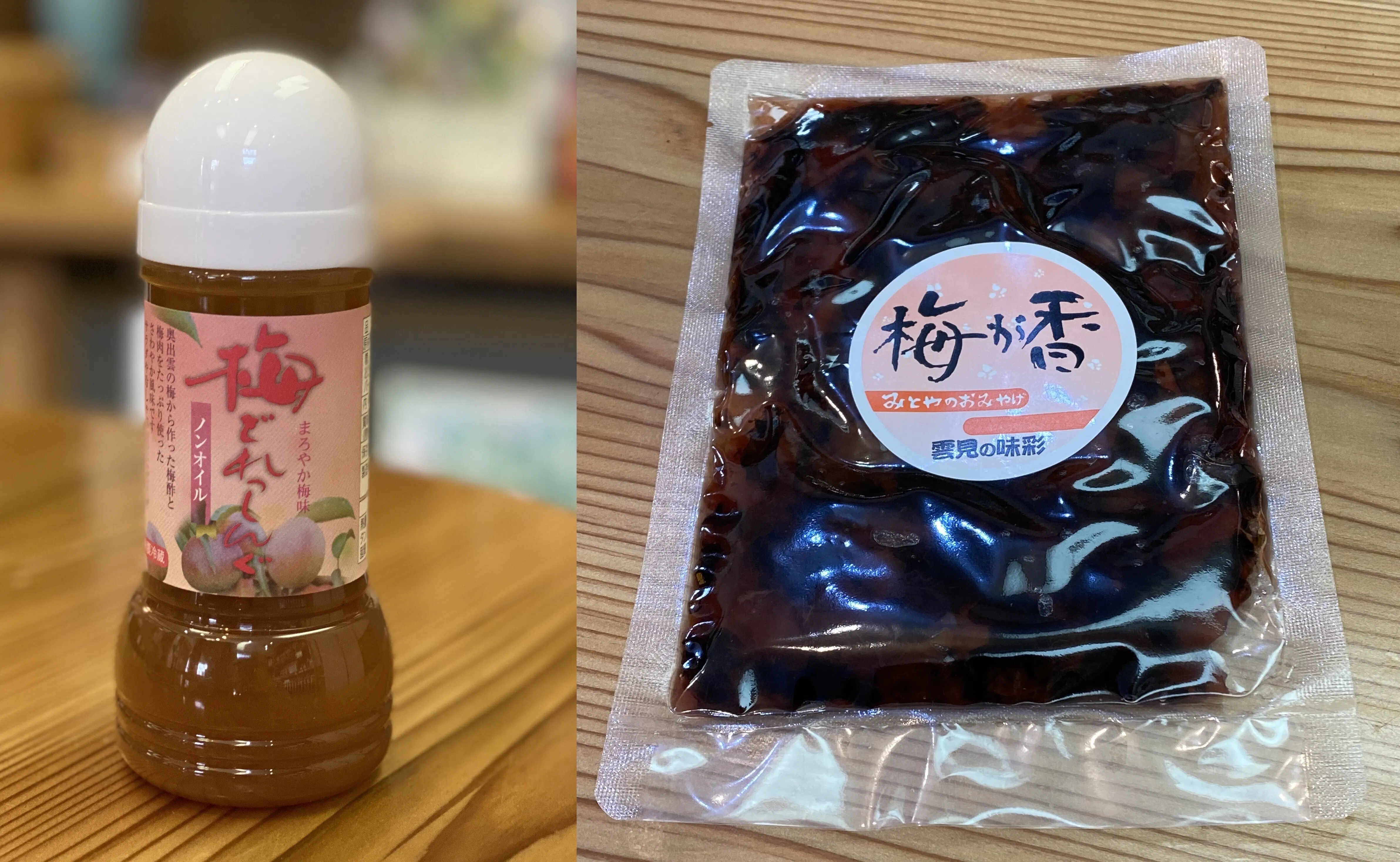 「梅どれっしんぐ」は文字通り梅を使ったドレッシング、さっぱり爽やかな風味で、夏はもちろん、秋から冬にかけても美味しくいただけます。「梅が香」は地元有志の方が作られて、紅梅しょうゆさんで販売されています。梅と赤しその砂糖漬け、お茶のあてに最適です。