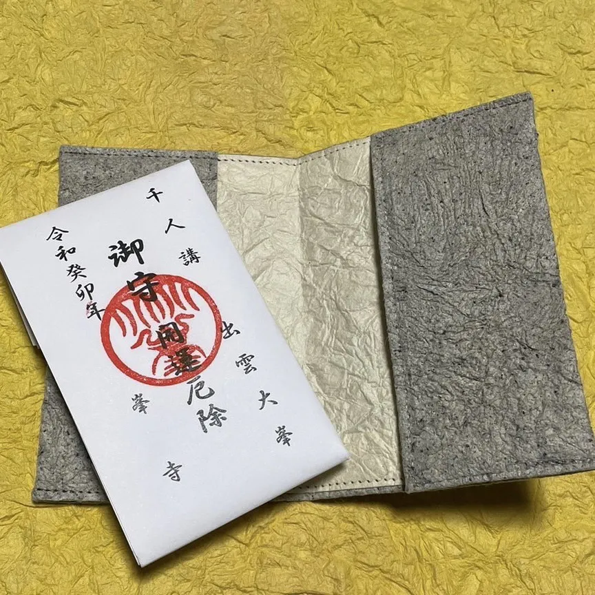 御守入れは「斐伊川和紙」さんにご協力いただきました。「斐伊川和紙」さんでは上質な和紙を使い様々な製品を作っておられます。今回は特別に峯寺の護摩供養で出た灰を混ぜ込み、この御守入れ自体が御守のようになっている、峯寺オリジナルのものです。