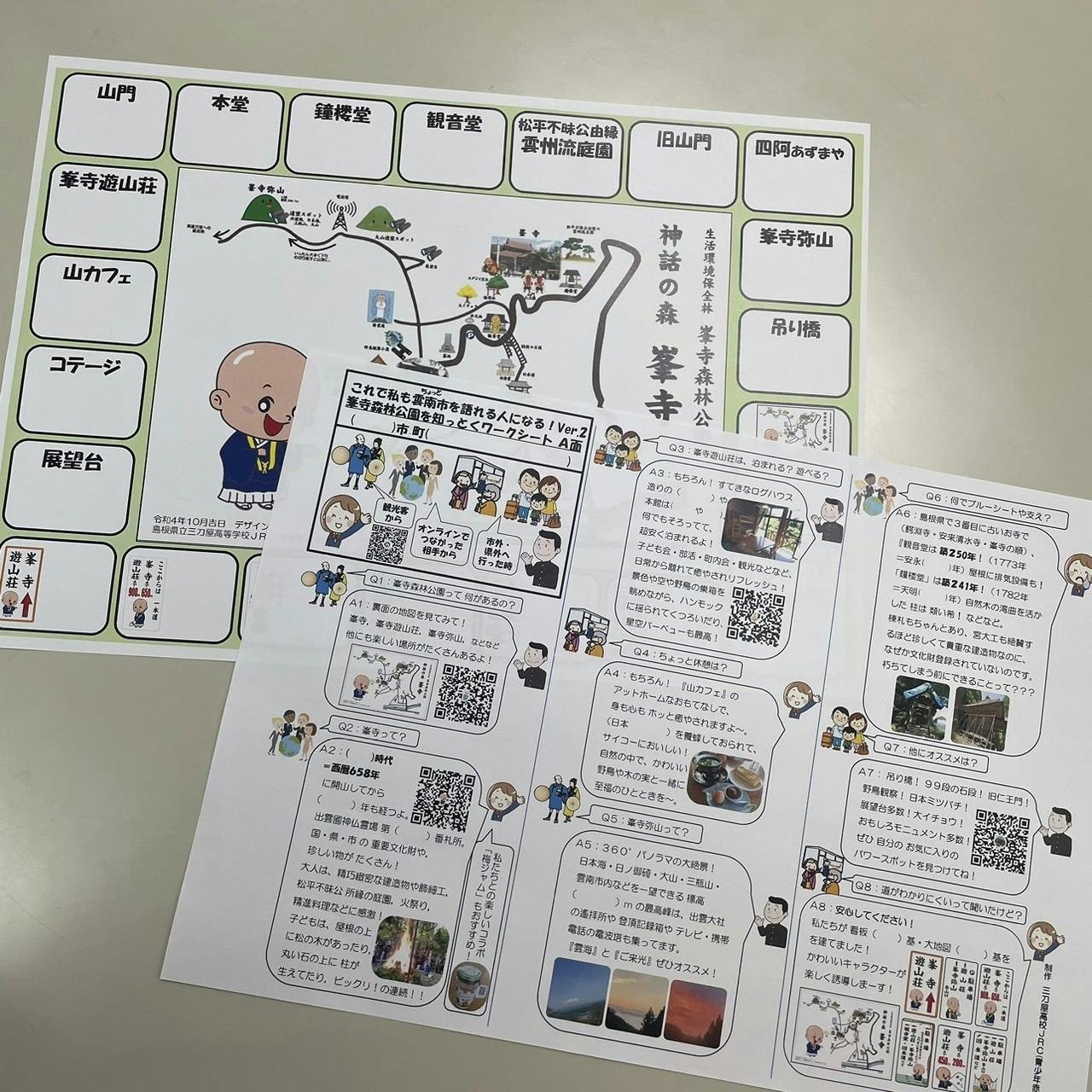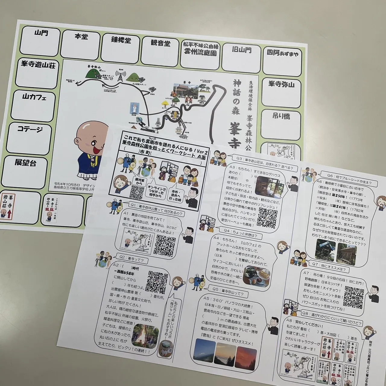 Ver.1は、三刀屋出身で、長崎で被爆しながら患者さんを看続け、2畳の部屋で療養しながら最後まで平和を訴えられた医師、永井隆博士の遺徳を顕彰する「永井隆記念館」のことについてのワークシート。これが評判をよび、Ver.2は峯寺森林公園となり、私がお話したことを高校生の視点でワークシートに仕上げていただきました。峯寺のことを知っていただくいいきっかけになると思います。
