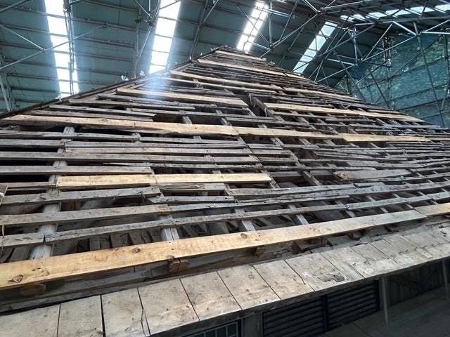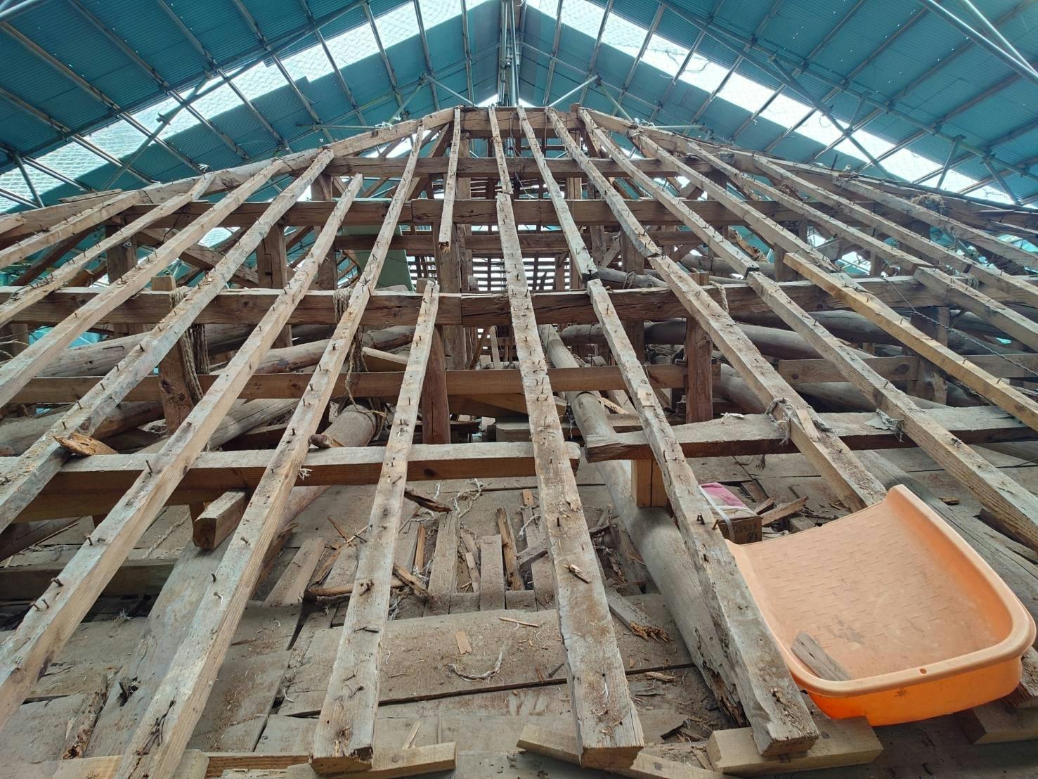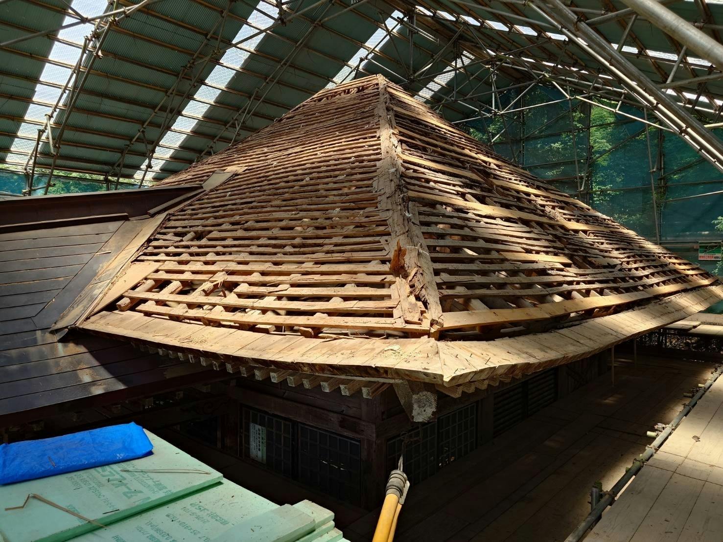 6月中旬:しっかりした下地ですが、写真中央の登る部材「隅木」の損傷が進んでいます。