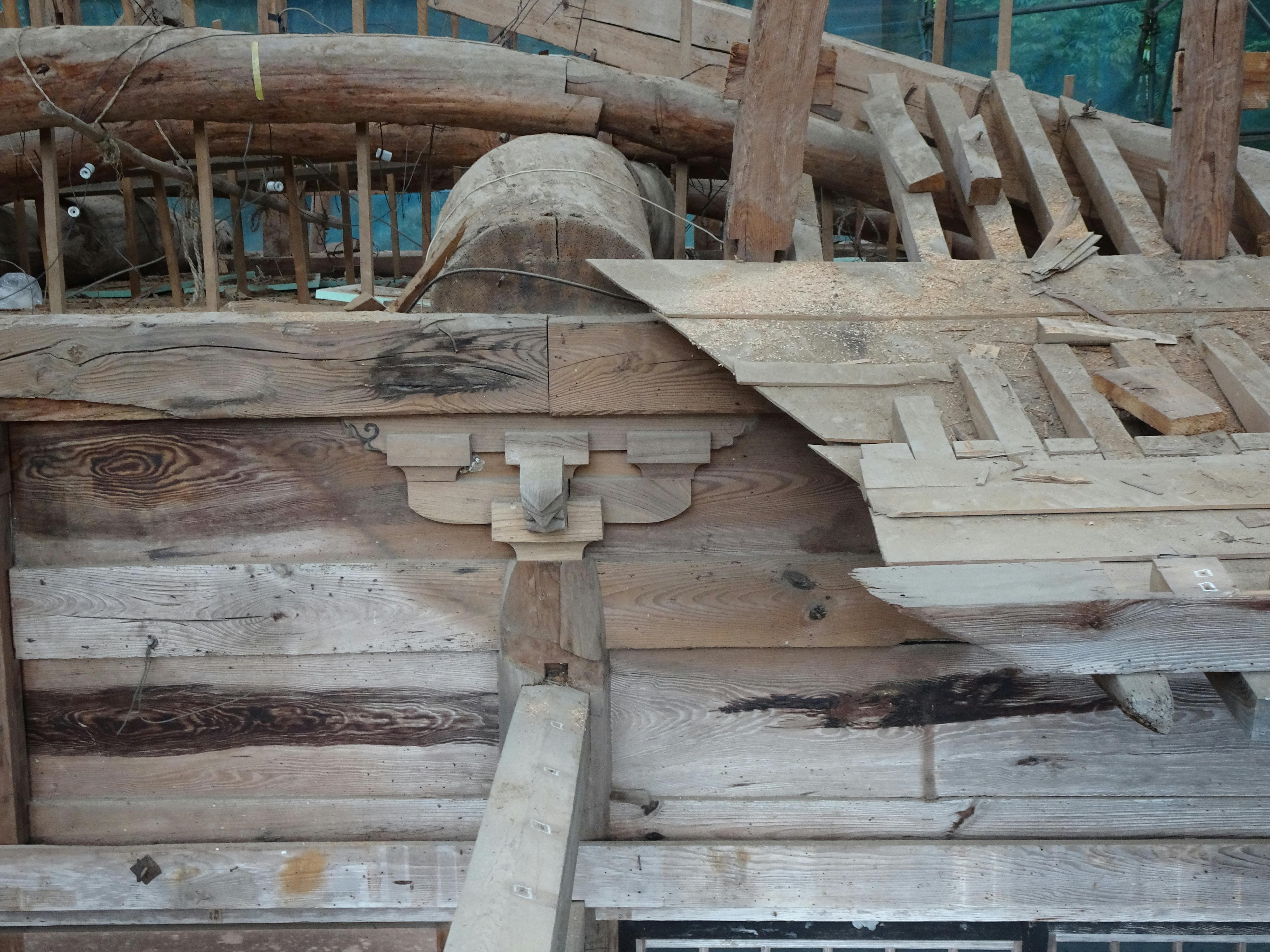 上記写真は、7月中旬でのものですが、「桝組」と言われる組み物が有りますが、材質感や仕上げ方などで周囲の木材状況と少し異なる「丁寧さ」が見て取れます。建物の歴史の途中で改修が行われた名残かもしれません。