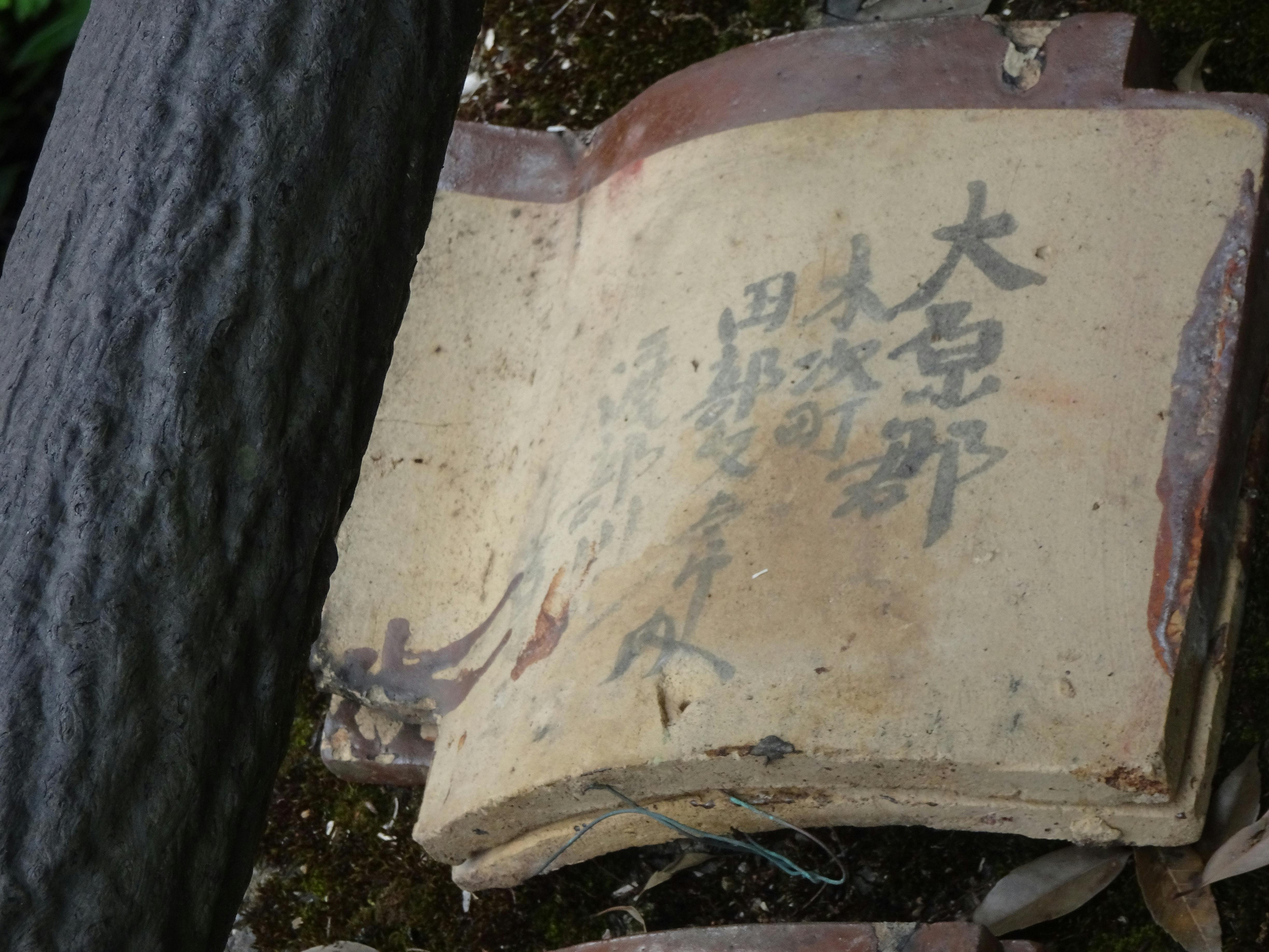 かつての屋根改修で確認された瓦の裏書です。 改修に関わった人か寄進などに貢献して頂いた方の署名でしょうか。 いろんな方々の想いが感じられる「軌跡」に敬服させられます。