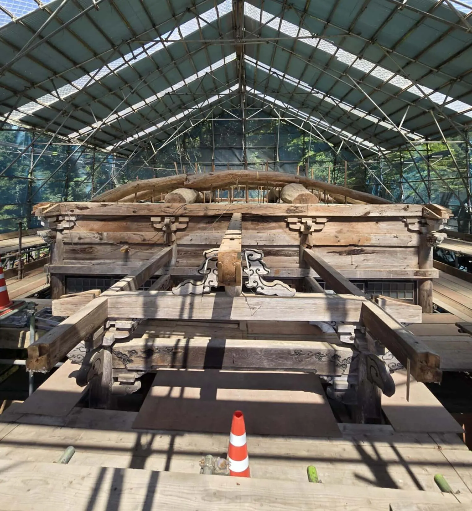 上記の写真は、現在の作業上屋内の状況です。 屋根の改修が主になりますが、不要な下地類までが撤去されました。歴史ある建物ということで職人の方々の丁寧な取り扱いにより、これからの本格工事準備が整ったという段階でしょうか。 現在は、他の作事場で材料の「刻み」が行われており、それが済むといよいよ新たな小屋組みの組み立てから進んでいくと思われます。