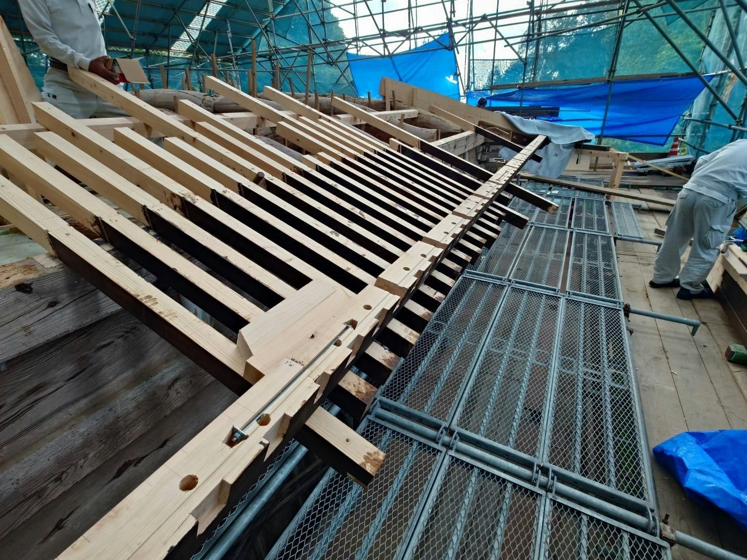 垂木に新旧の部材があることが分かると思います。建物の価値を認めて改修される工事では、「使える材は極力再利用」して歴史を継続していきます。