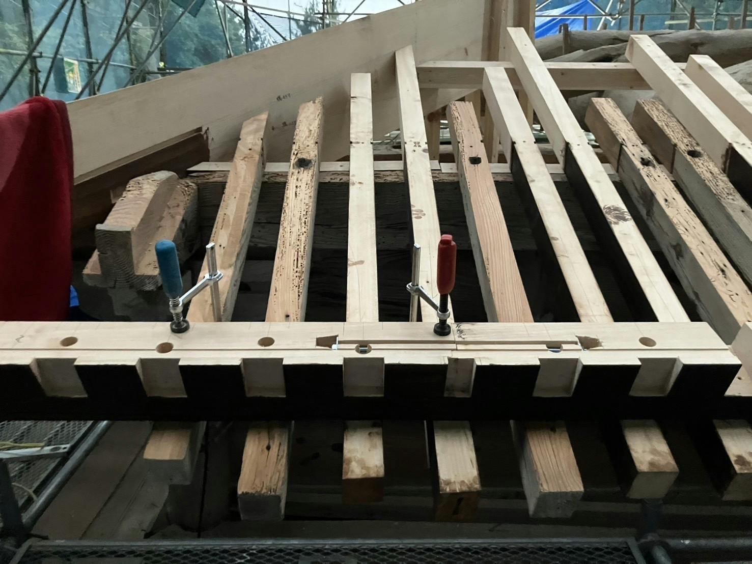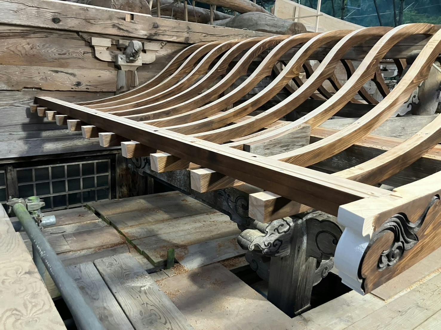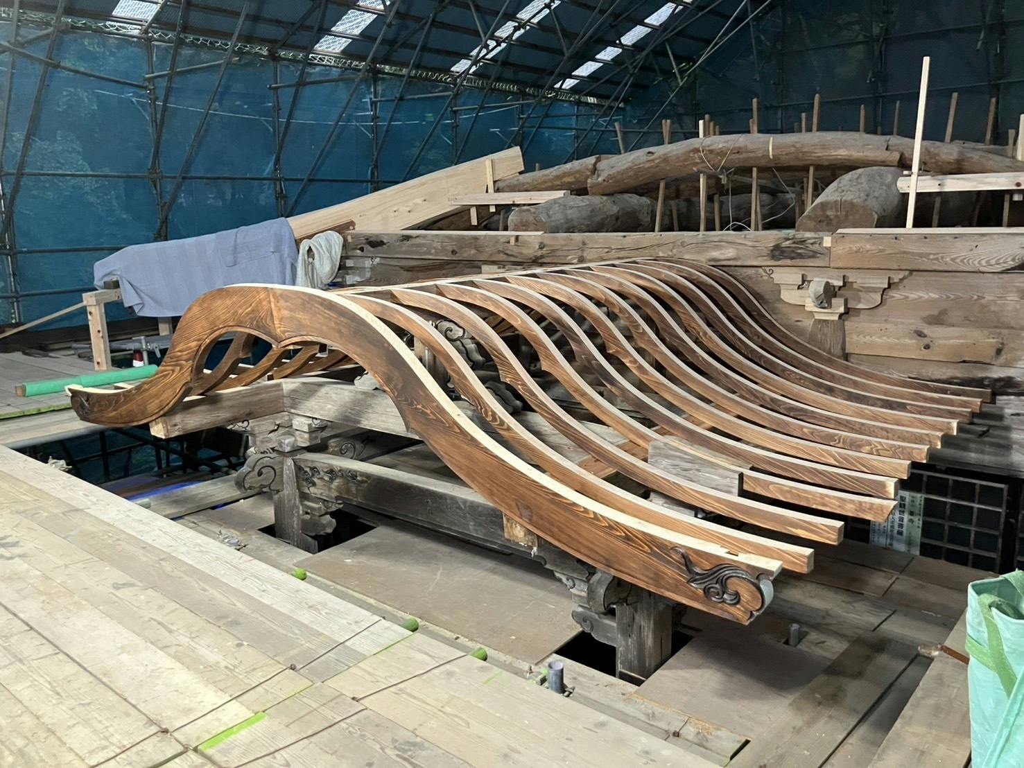 向拝部の唐破風屋根の垂木が揃いました。着色がされていますが、完成したときの新旧の部材の違和感を軽減するために「古色塗装」を施しています。