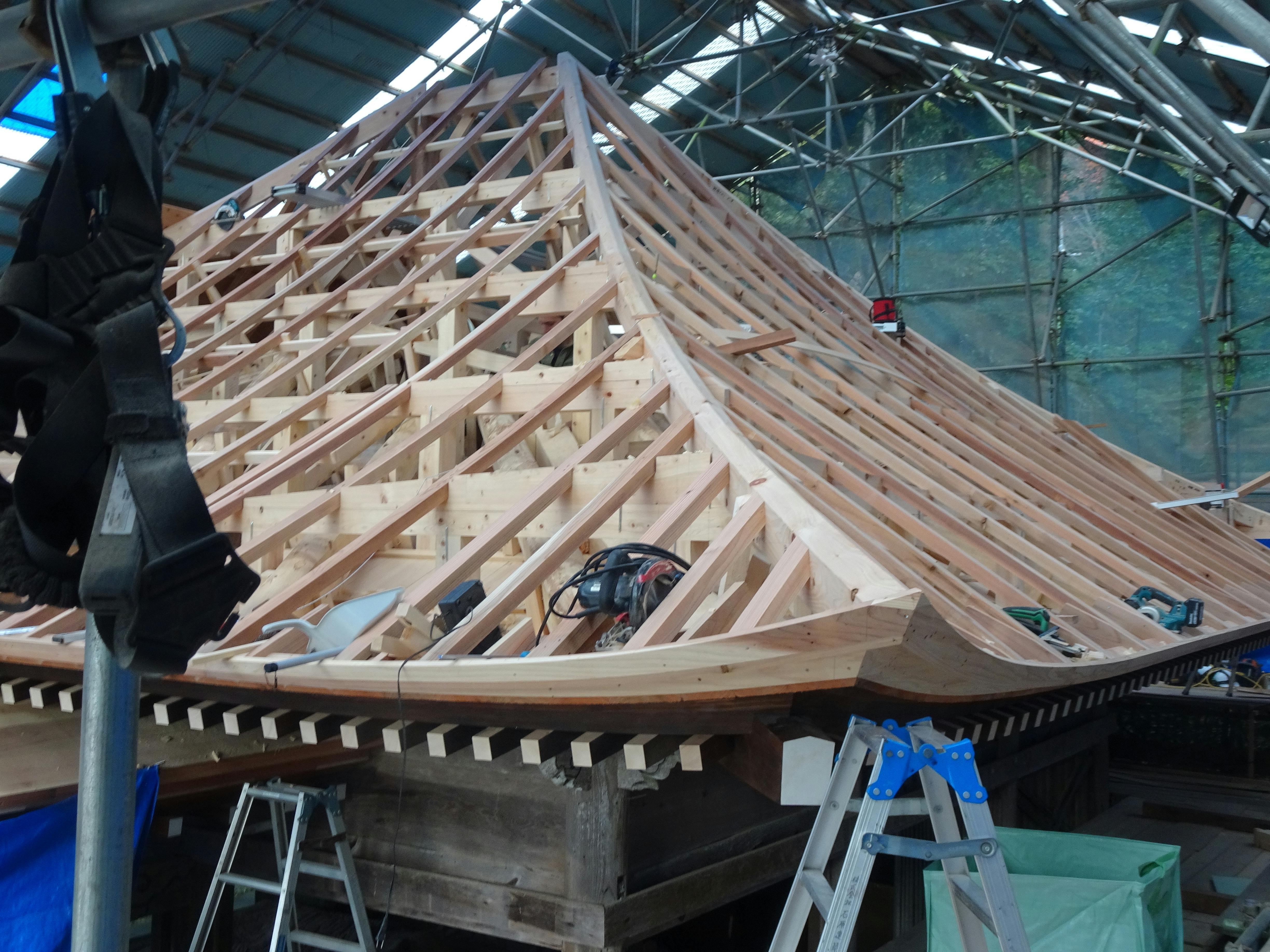 隅棟を境に板貼りと垂木状況が見られます。板貼りも勾配に合わせ1枚毎に慎重に合わせて作業が進めらています。