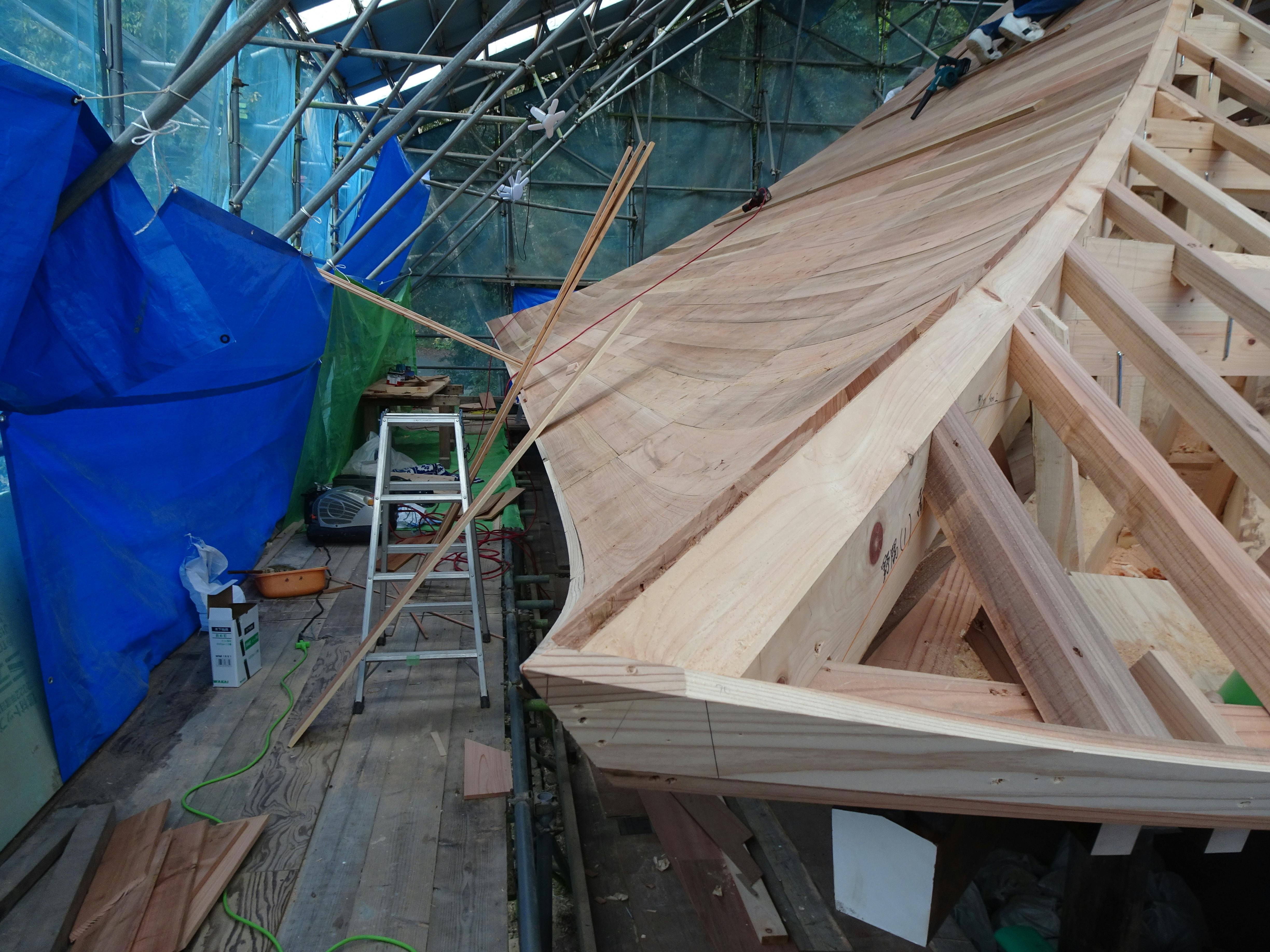 流れ方向に細い部材「垂木」が設置されていますが、ご覧のようにほぼ1本毎に長さ・勾配が異なり、現場合わせで作業が進められていきます。施工に時間を要することが察しられます。