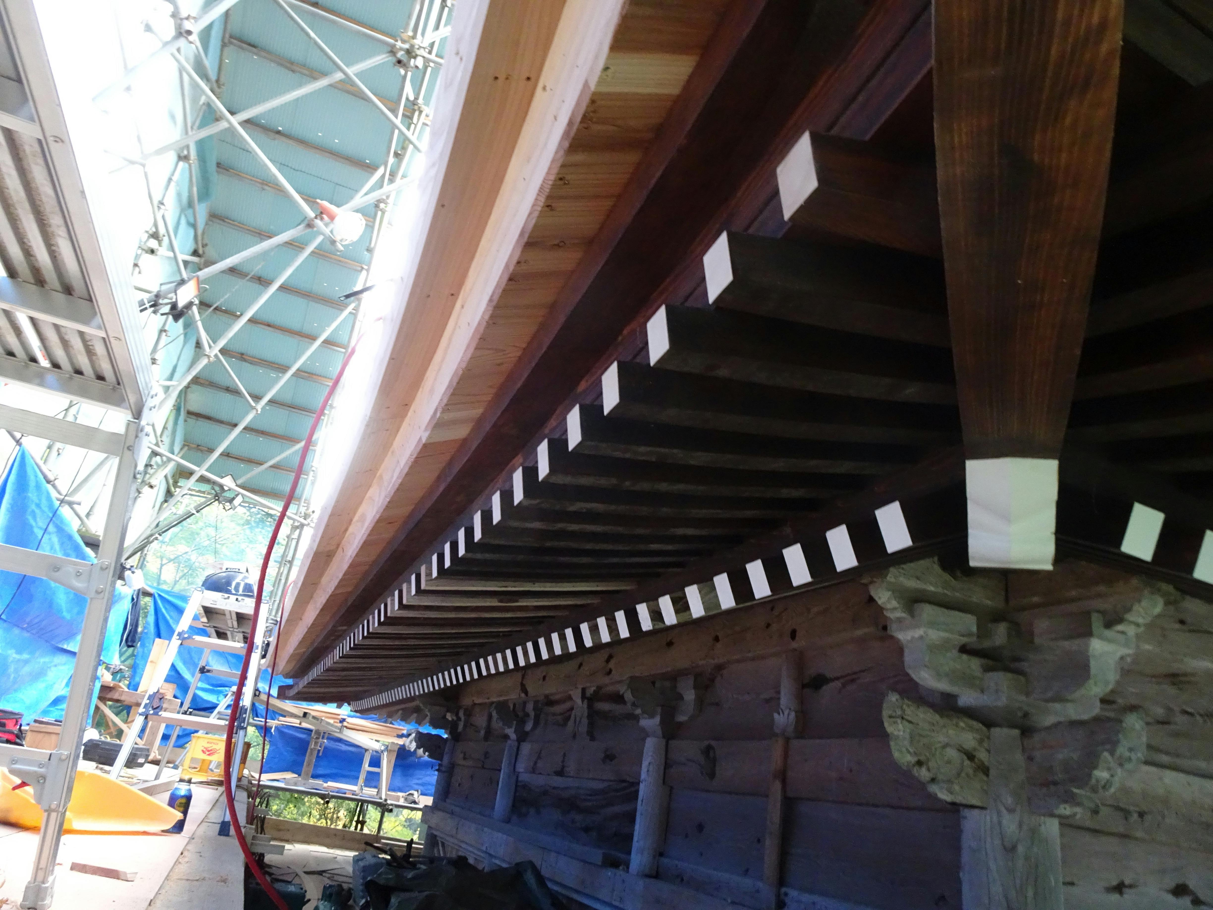 屋根下側の化粧垂木は2段で、古色塗装されています。先端が白いのは化粧でもありますが、木の切り口からは水を吸いやすいため、防水を兼ねての塗装になります。