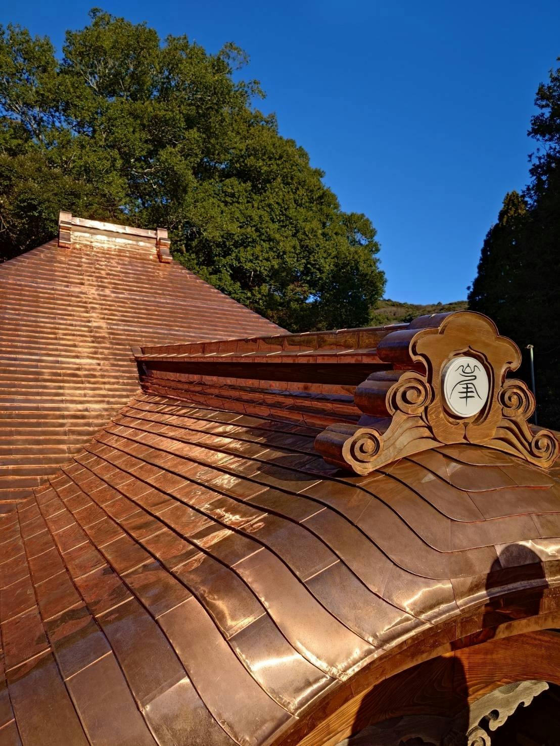 完成直前の銅板葺きの鬼瓦も板金職人の腕前による銅板加工です。新しい銅板なので光っていますが、銅特有の「緑青」という錆で徐々に燻みますが、その錆の効果で数百年でも銅板は維持できます。