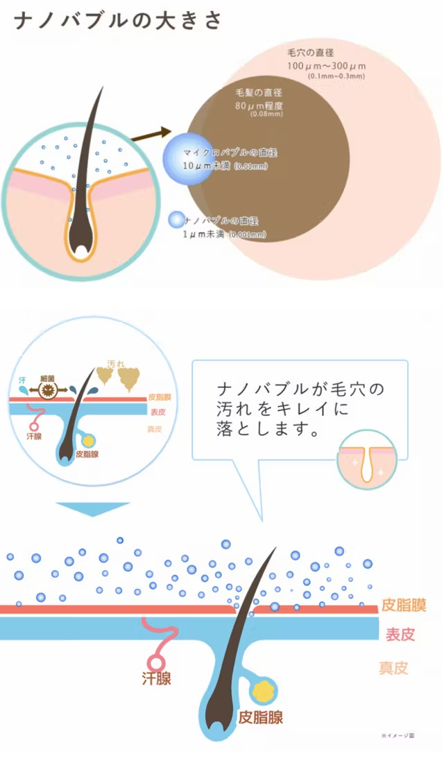 ナノバブルは毛穴の直径よりも非常に小さいサイズになるため、毛穴の奥まで入り込んで汚れを落とし、毛穴を洗浄します。