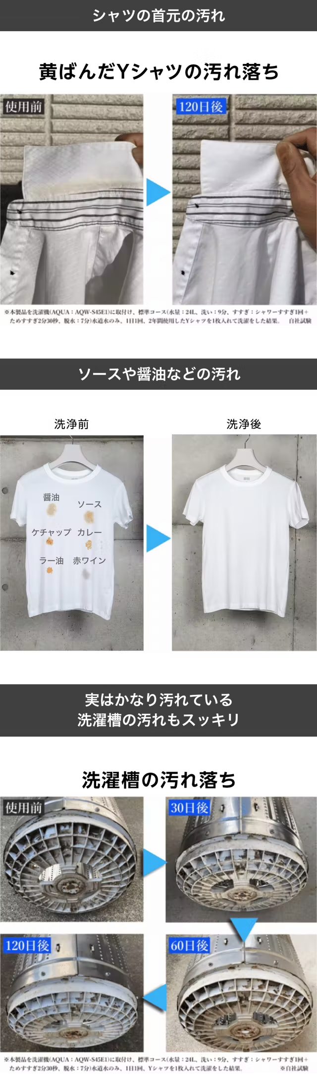 ※シャツも洗濯槽も汚れやシミの種類・定着具合によって汚れの落ち具合が変わることがあります。