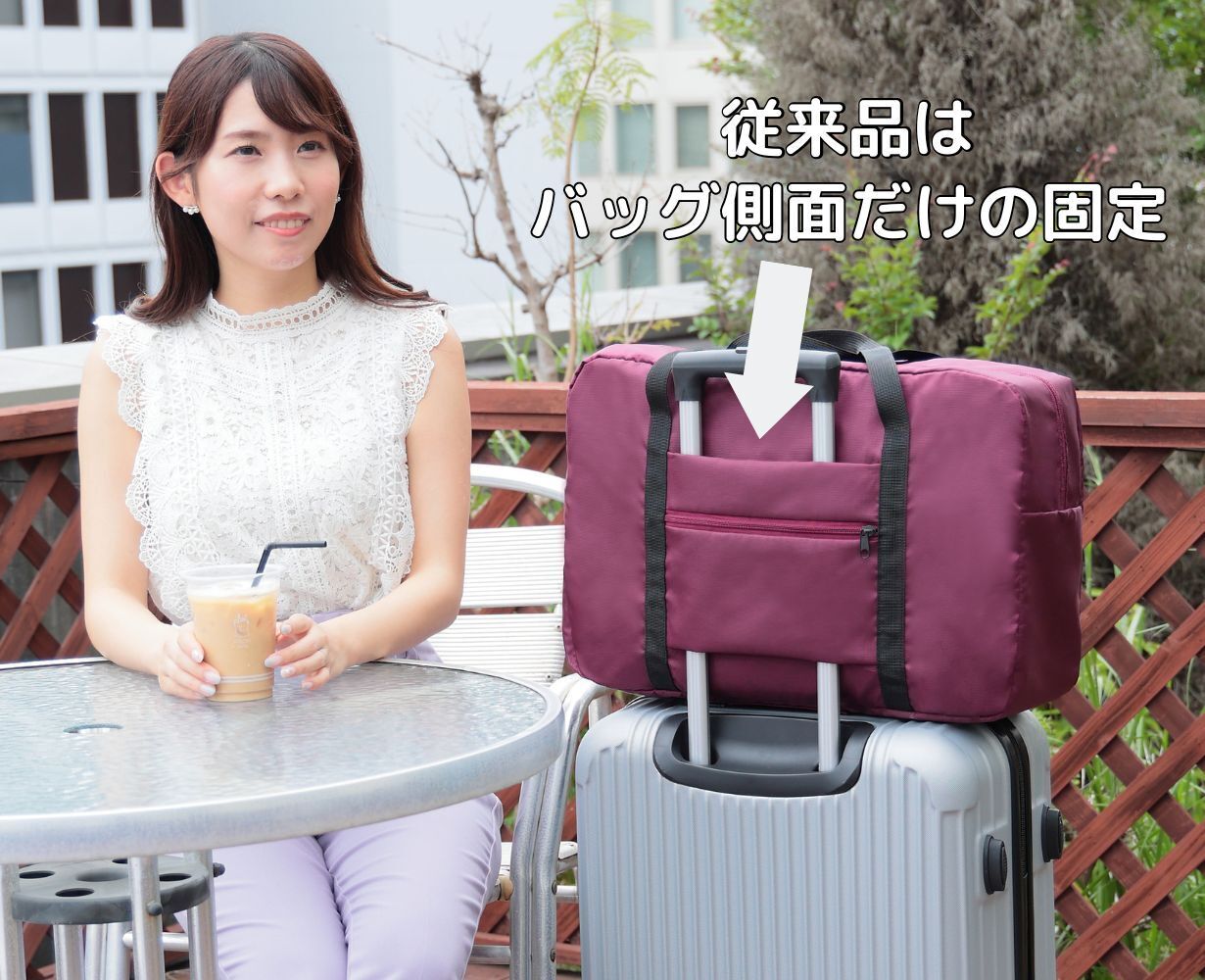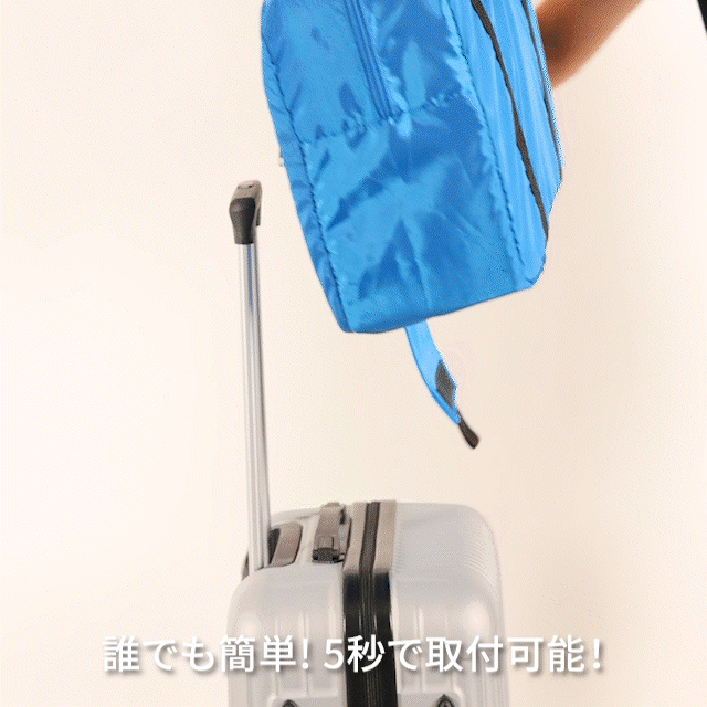 新発想キャリーオンバッグは、ハンドルバーに固定する「側面固定」だけでなく、スーツケース上部のグリップにバッグの底面を固定する「底面固定」もできる仕様になっています。