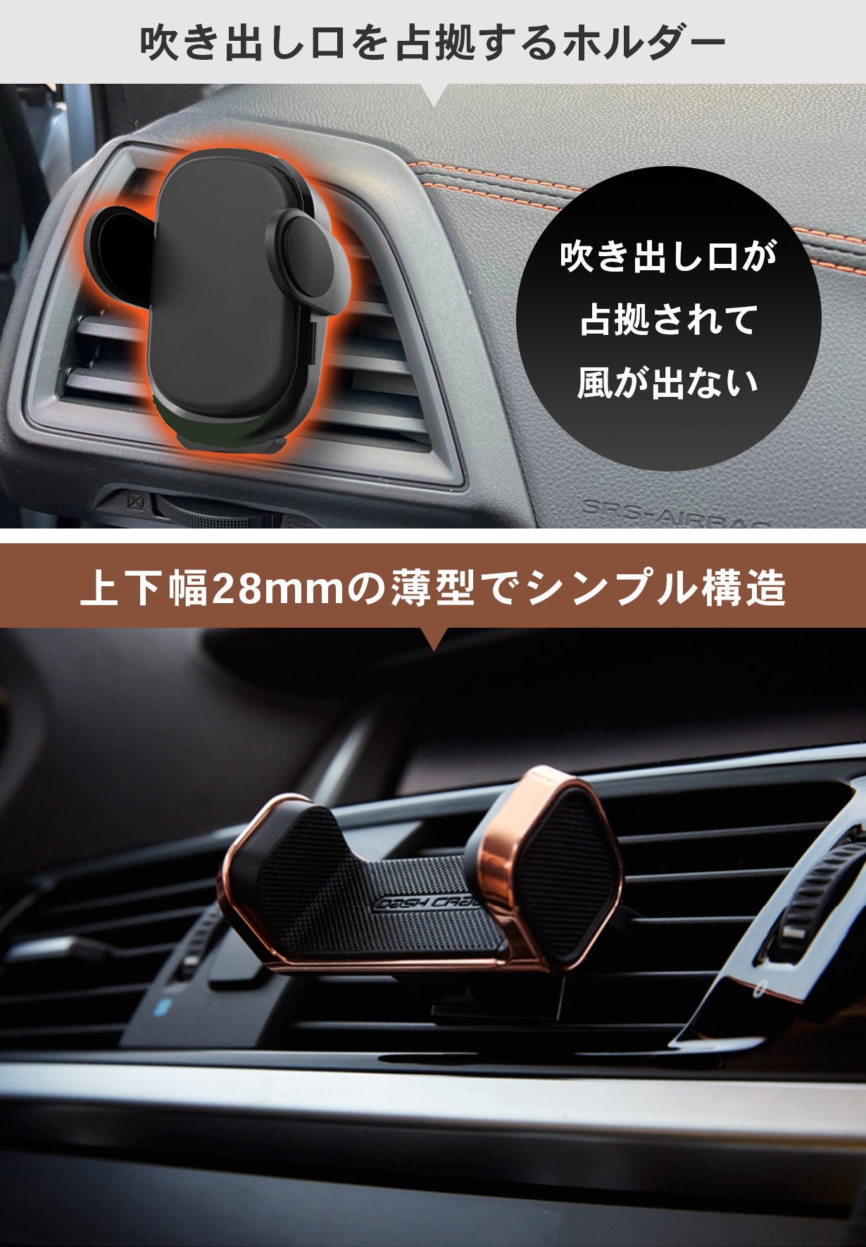 車載用のスマホホルダーと言えば、エアコンの吹き出し口に取り付けるタイプが主流かと思います。