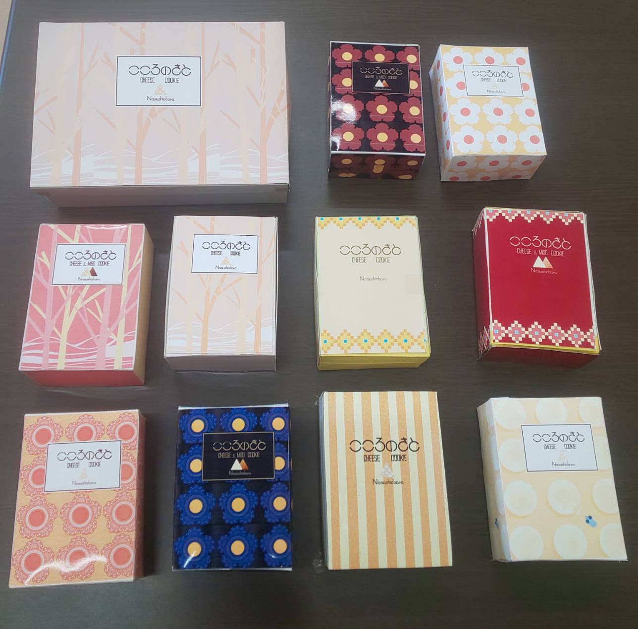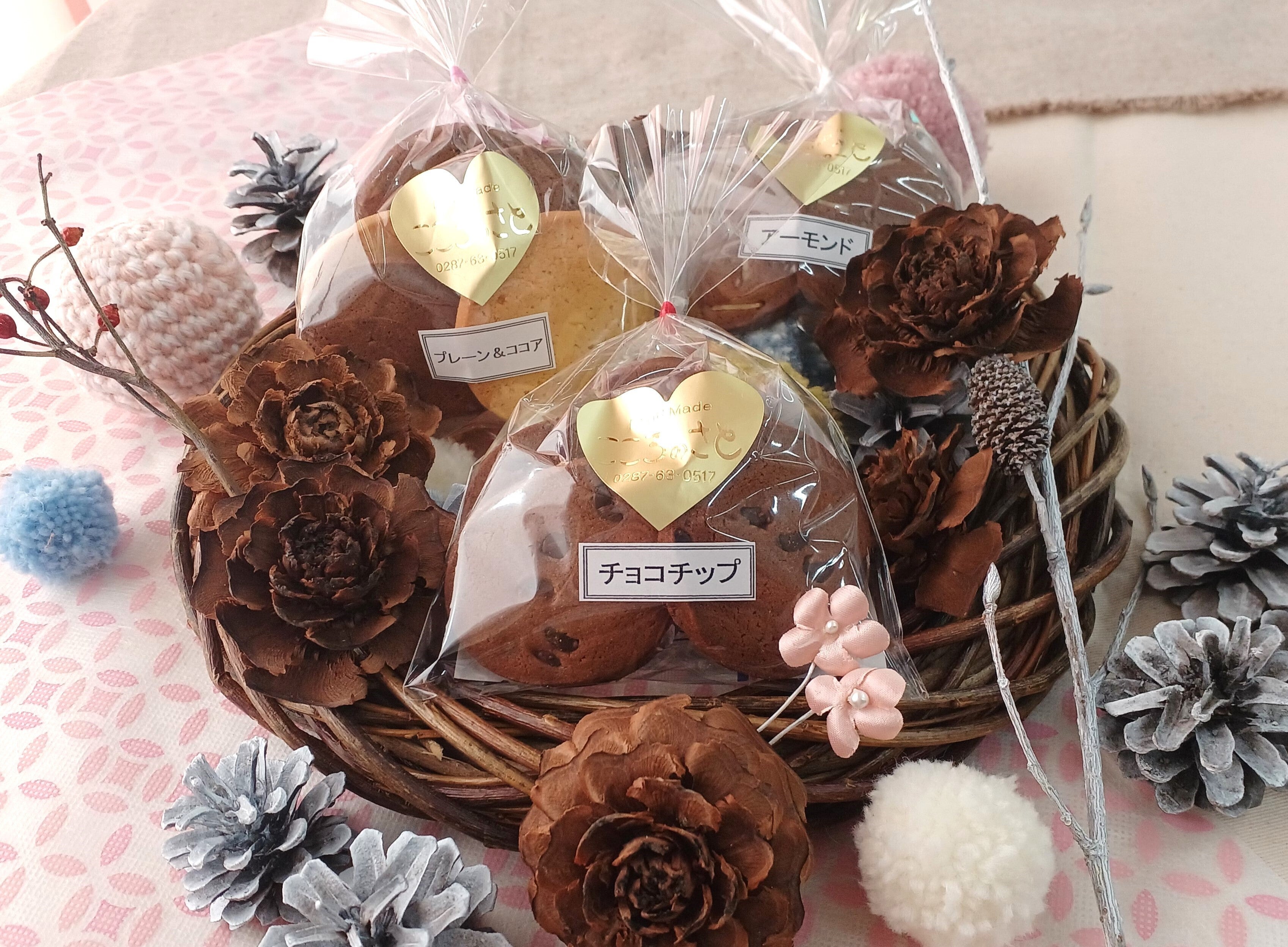 開発中のチーズクッキー、チーズ味噌クッキー他、30年、材料、味を変えずに販売してきた定番商品のプレーン、プレーン&ココア、カレンズ(ラムレーズン)、黒糖、アーモンド、くるみ、チョコチップ、みそ、ゴマ、コーヒークッキーのいずれかの詰め合わせとなります。