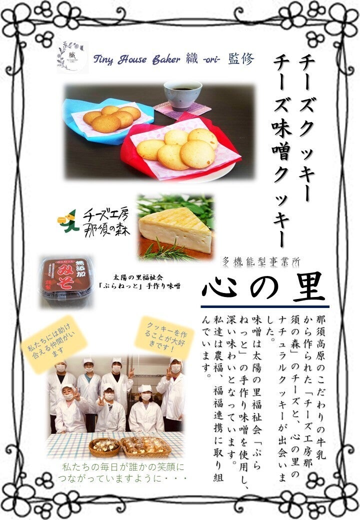 今回開発しているチーズクッキーは地元那須塩原市の【チーズ工房那須の森】のチーズを使用、チーズ味噌クッキーはチーズに加えて、同業種の【太陽の里福祉会 ぷらねっと】の手作り味噌を使用しています。また、味に関しては、地元の有名菓子店【タイニーハウスベーカー織】さんの監修をいただきました。