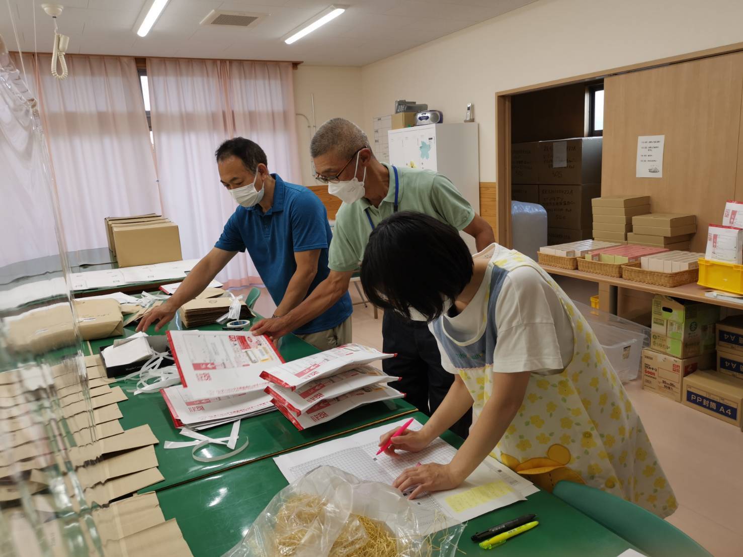 梱包、宛名を貼付け、順次配送を行っておりますので、数日中には皆様のお手元に届くと思います。なお、近隣市内でスタッフが手渡し可能な方は直接お渡しにあがりますのでお待ちください。