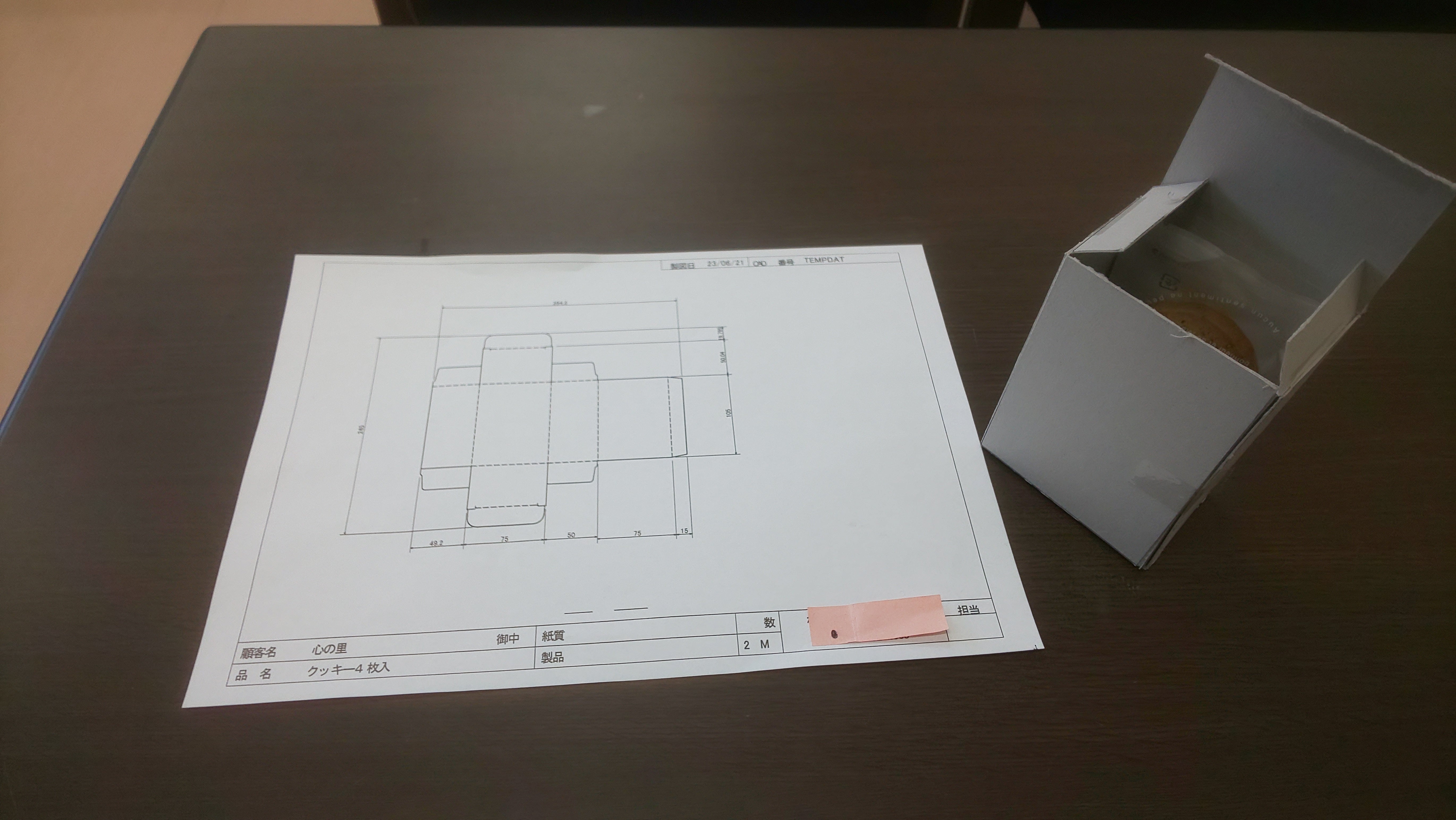 先日ご報告した、「個包装袋」のサイズが決定しました。袋のサイズが決まらなかった為、箱のサイズも確定出来ずにいましたが、サイズが決まったことでようやく箱の作成に取りかかれます。本日は展開図とサンプルで打ち合わせをしました。今後は個包装と箱の印刷デザインについて進めていきたいと思います。また後日経過報告させていただきます。