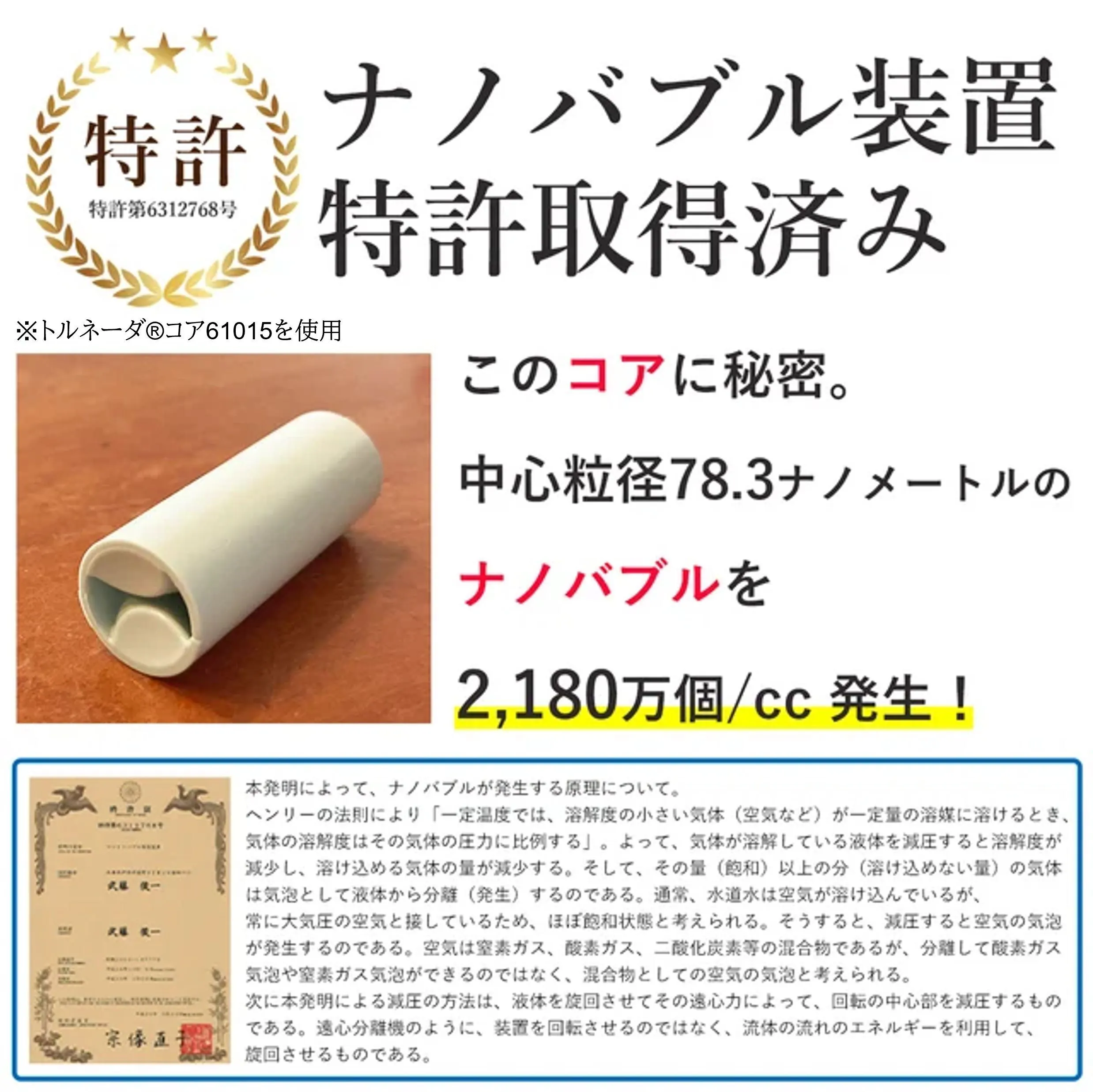 特に肝であるナノバブルコアは、特許を取得し、超微細なナノバブルを発生させることの出来る自信作です。