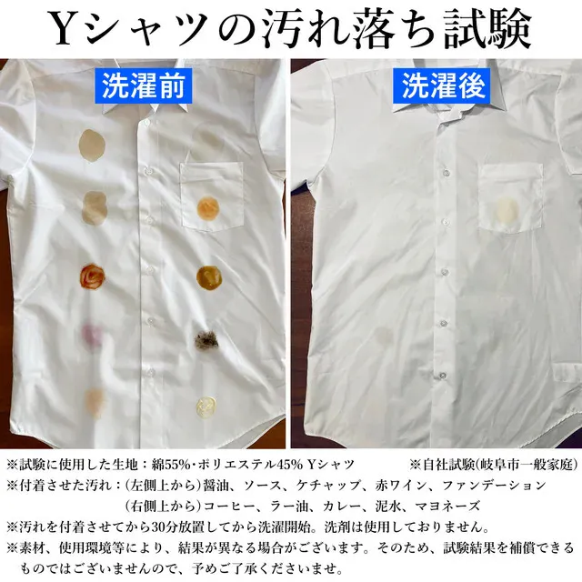 ※ソースや醤油などの汚れについての試験は、本製品を洗濯機(AQUA:AQW-S45E1)に取り付け、汚れを付着させてから15分間放置後に標準コース(水量:24L、新居:9分。すすぎ:シャワーすすぎ1回+ためすすぎ2分30秒、脱水:7分)水道水のみ、Tシャツを一枚入れて洗濯をした結果。