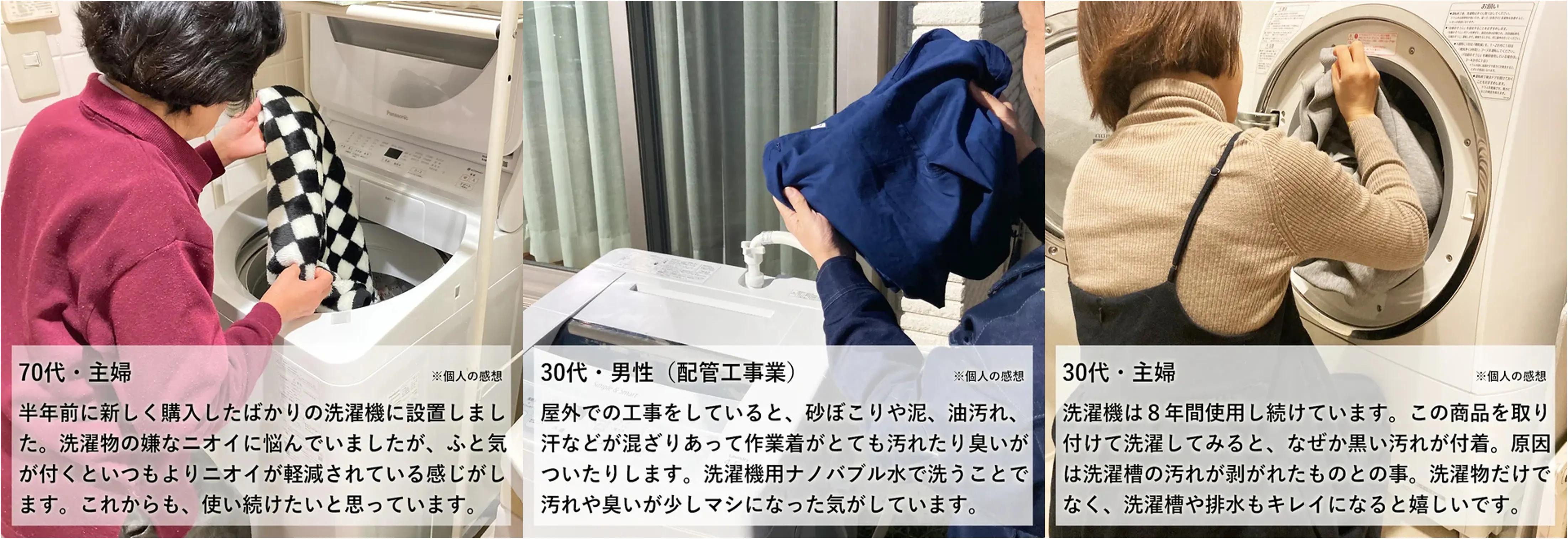 本製品を取り付けることで「洗濯物の汚れ落ち」「洗濯槽の汚れ落ち」「排水の汚れ落ち」にお役立ていただけます。