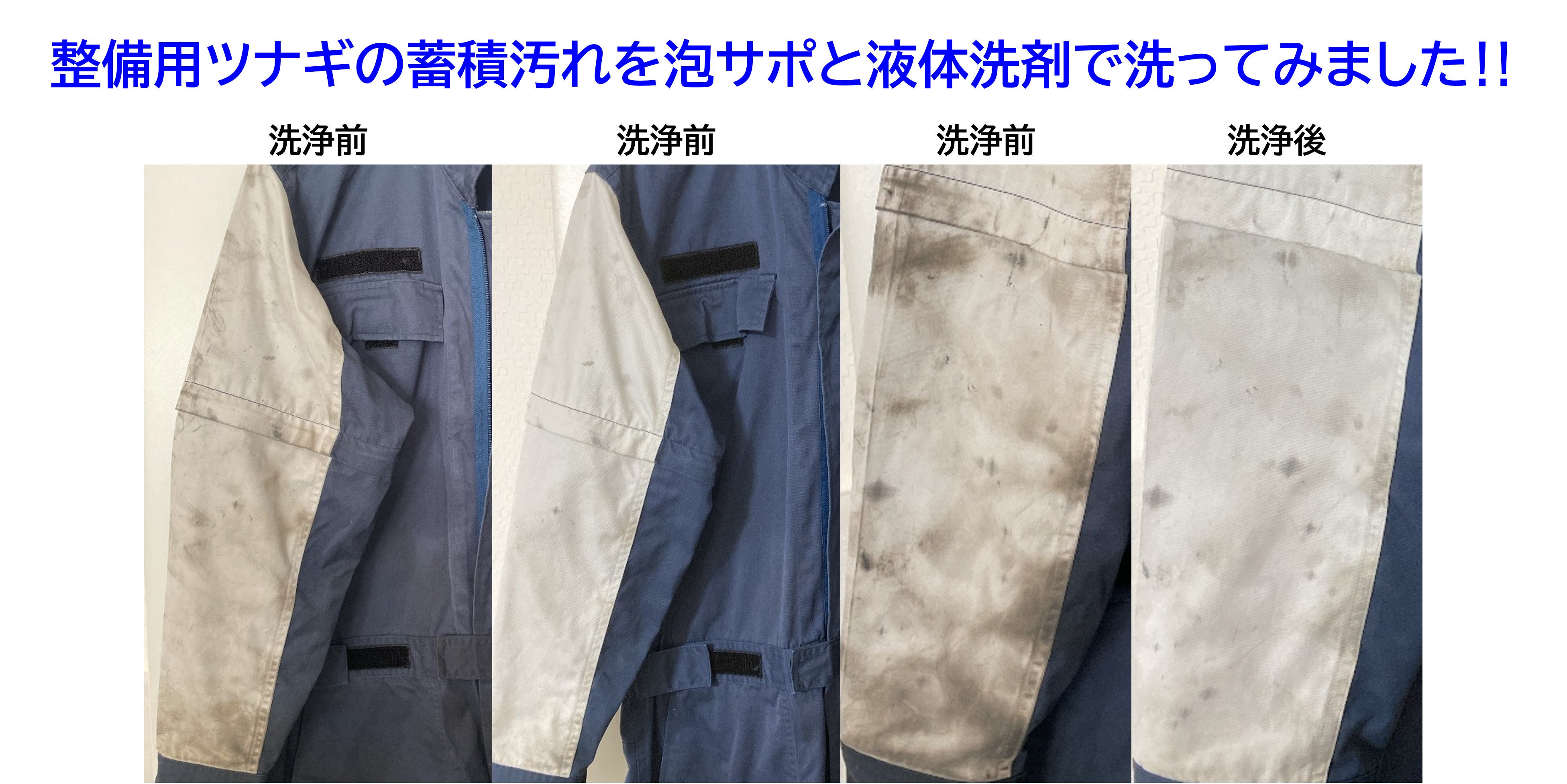 この度は「『泡サポ』で今お使いの洗濯機をスーパーナノバブル洗浄にグレードアップ!」プロジェクトにご関心及びご購入頂きまして誠にありがとうございます。さて、掲題の件ですが、弊社のお取引先の整備工場の従業員の方が『エトスさん、この蓄積汚れって落とすこと出来る?』といってお持ちいただいたのが作業ツナギでした。その従業員の奥さまが何度も洗ってきたらしいのですが、ギアオイルなど鉱物油の汚れが落すことが出来ず、蓄積した汚れとなっておりました。かなり手ごわい汚れということで、25Lのポリバケツに泡サポを通した水と液体洗剤で1時間ほど浸け置きし、手もみで洗体を擦った後、泡サポを装着した自動洗濯機の『標準コース』を2回行いました。その洗浄前と洗浄後の画像が上記となります。テストしたツナギはポリエステル65%の為、一般的な洗剤を使用すると特にグレーイングが顕著に現れてしまいますが、泡サポを併用することと、漬け置き手揉み洗いをすることで洗浄効果が大きくなり、特に明色部分のグレーイングを取り除く効果は絶大です泡サポは液体洗剤との相性はとてもよく、他社製品と比べても非常に細かい泡の粒径によって、繊維の奥まで洗剤成分を運んでくれます。その為、このような諦められていた蓄積汚れでも落とすことが出来ました。さすがに全ての汚れを落とすことは出来ませんが、ここまで汚れを落とすことが出来ると洗濯が楽しくなってきます。ご参考まで。
