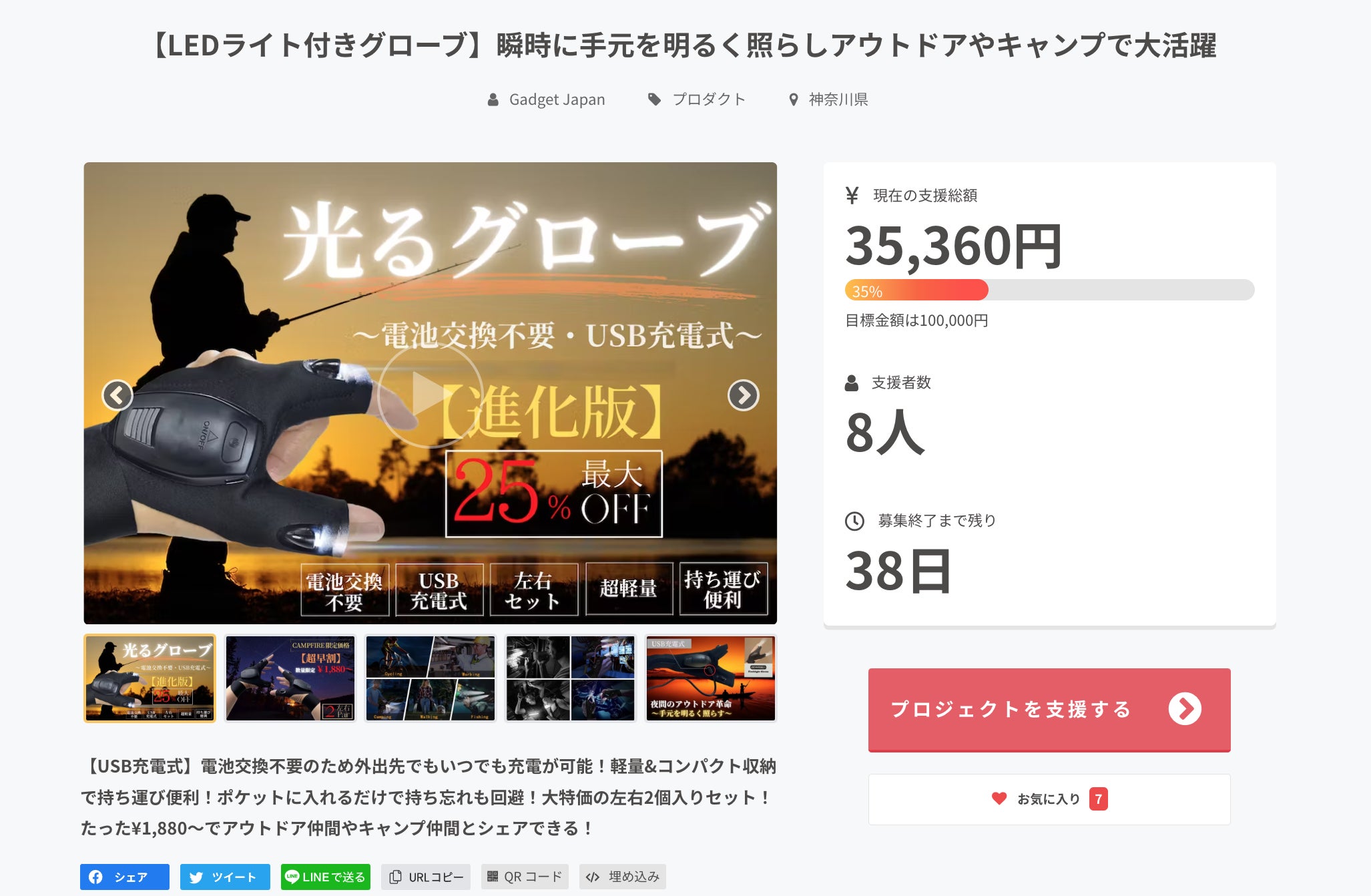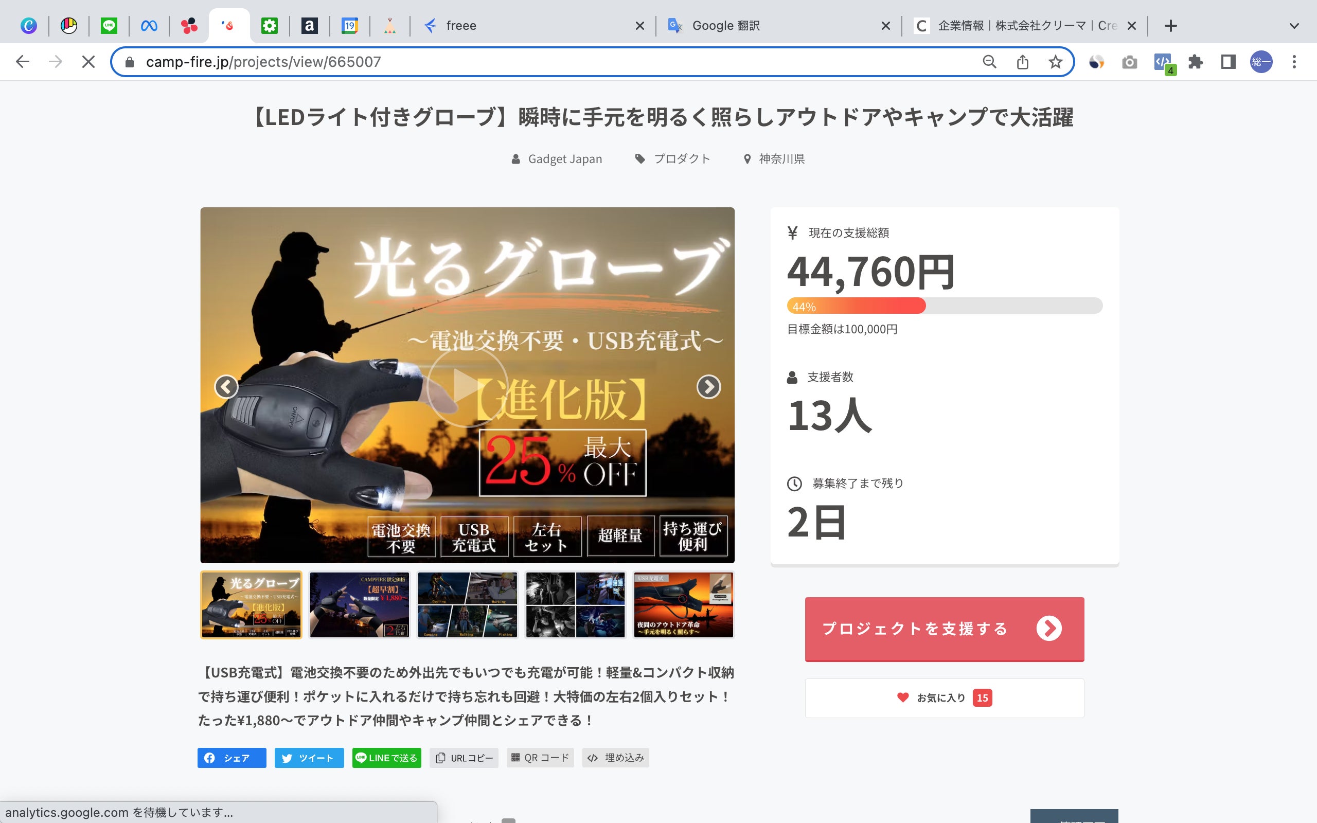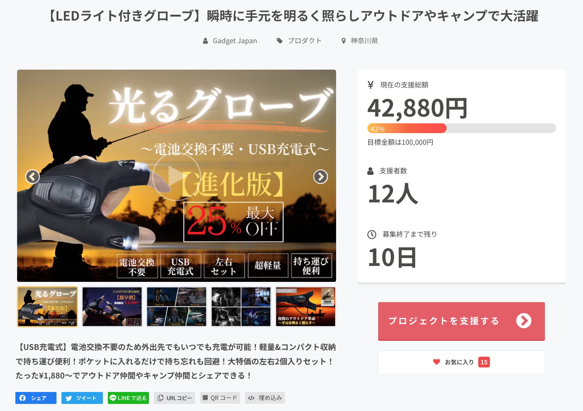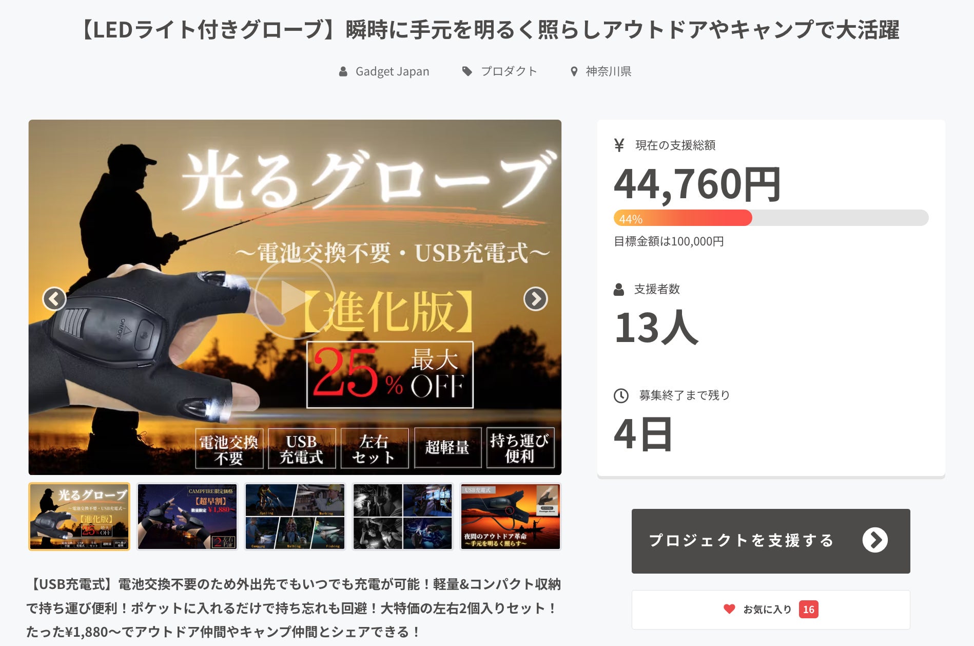 お世話になっております、Gadget Japanです♪いつも活動報告をご覧い頂き、誠に有り難うございます!!現在公開中の『光るグローブ』ですが、多くの支援者様から大変心温まるご支援を頂き、いよいよプロジェクト終了まで...いよいよ『残り2日』となりました(^_^)これからのシーズン『キャンプ』『釣り』『ウォーキング』『DIY』『防災グッズ』etc...様々なシーンの夜間作業をより快適にしてくれる便利アイテムとして、多くの方々から、高くご評価を頂いております(^ ^)今回目玉の『セット割引』は、特に割安でご提供が可能ですので、家族や友人とのシェアも含めて、より多くの方々にご利用頂けたら思っております♪ご興味の程、宜しければ、SNSでのシェアやリツイートをはじめ、当商品の認知拡大のご協力を頂けたらとても嬉しいです^ ^引き続き、心温まる応援の程、宜しくお願い申し上げます!
