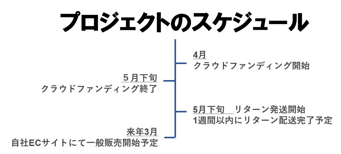 ※本文中に記載させていただいたスケジュールは、あくまでプロジェクト公開時点の予定です。クラウドファンディングの性質上、配送遅延のおそれがございます。