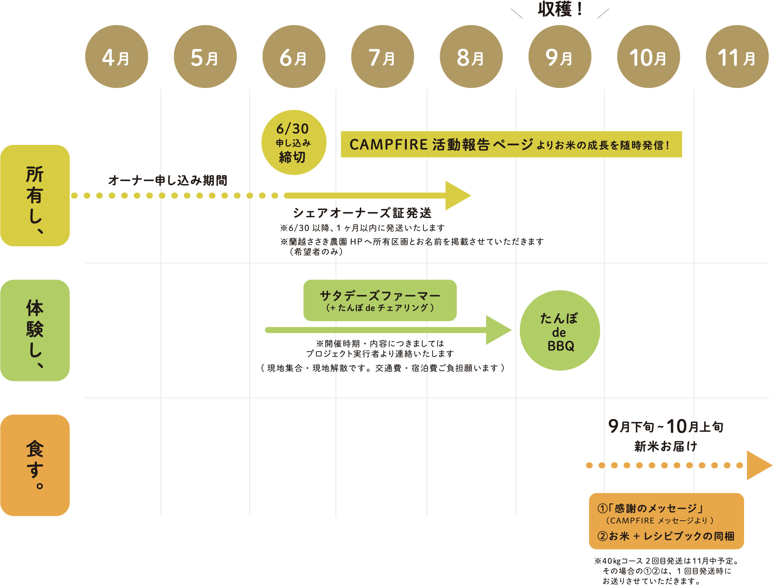 (2023年5月 → 2023年9〜10月の収穫期までの間)、田んぼのオーナーになれる制度です。ただ、お米が届くだけでなく、ささき農園と一緒に苗から収穫までの流れを一緒に味わう楽しい体験プログラムもご用意いたします!