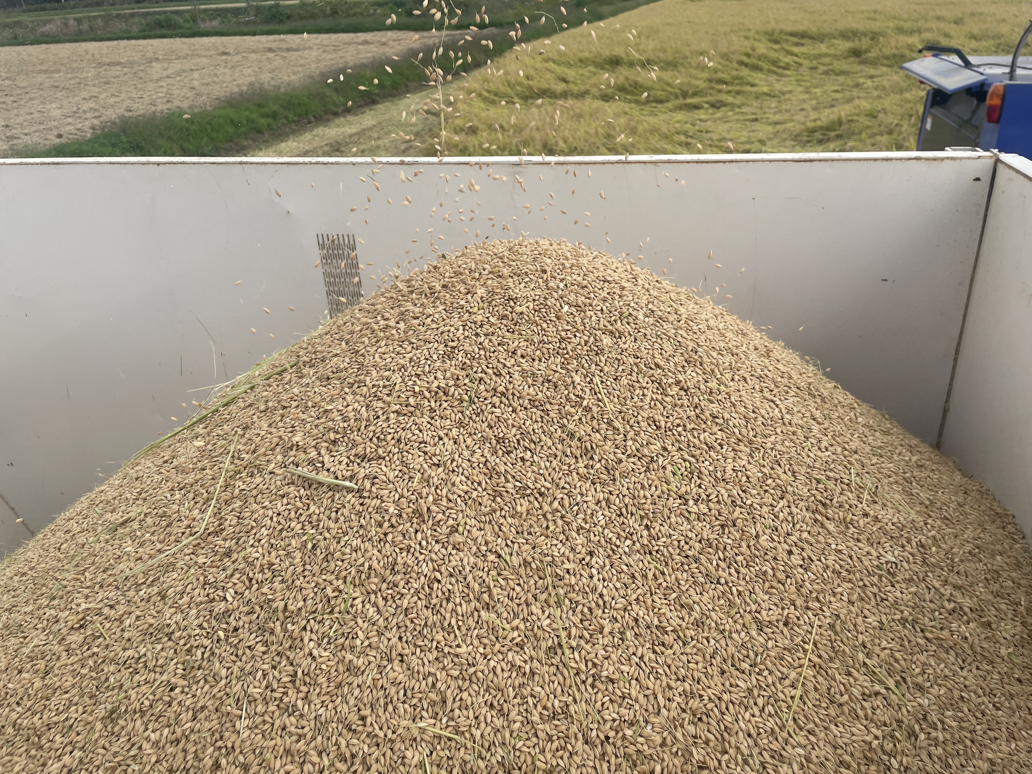 刈り取った直後のお米。刈った稲は、トラックに積んで乾燥機運びます。これを何度も何度も繰り返します!