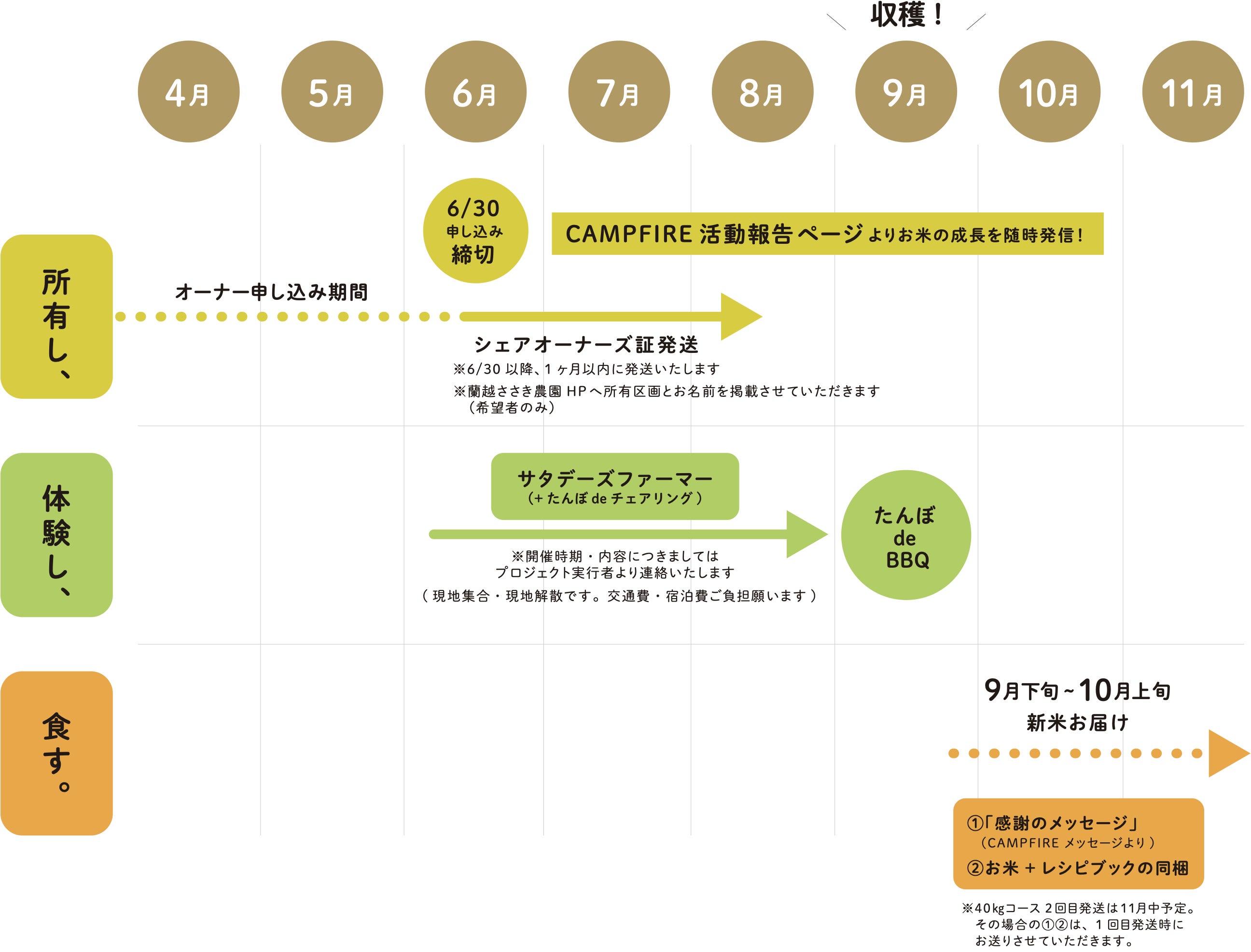 収穫時期には、新米の炊きたてごはんとBBQ「たんぼ de BBQ」をささき農園敷地内で実施いたします。「たんぼdeBBQは」BBQを楽しみながら新米を食べることができるイベントで、佐々木氏、シェアオーナー様同士が交流できる会です。ささき農園とシェアオーナー様だけでなく、オーナー様同士のコミュニケーションを大切にしていけるような会にしたいと思います!(※現地集合現地解散、交通費・飲食費・宿泊費等は参加者様にてご負担願います)