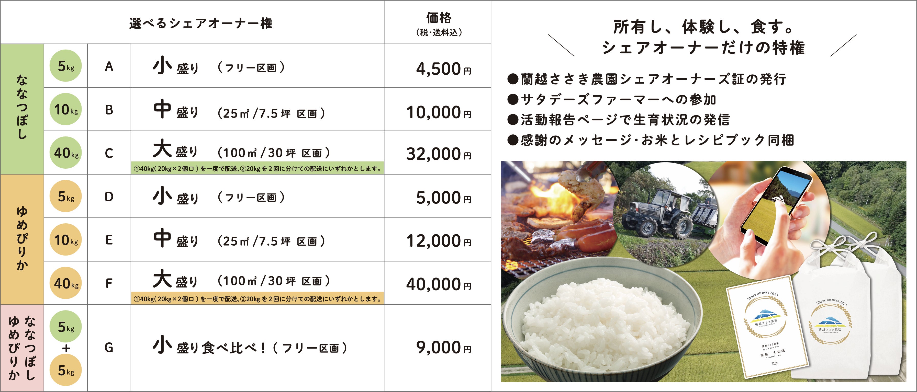 品種は、「ゆめぴりか」「ななつぼし」のいずれかより選んでいただくことができます。また、シェアオーナーになっていただいた方には、田んぼ所有権を証明するシェアオーナーズ権利証をお届けいたします。