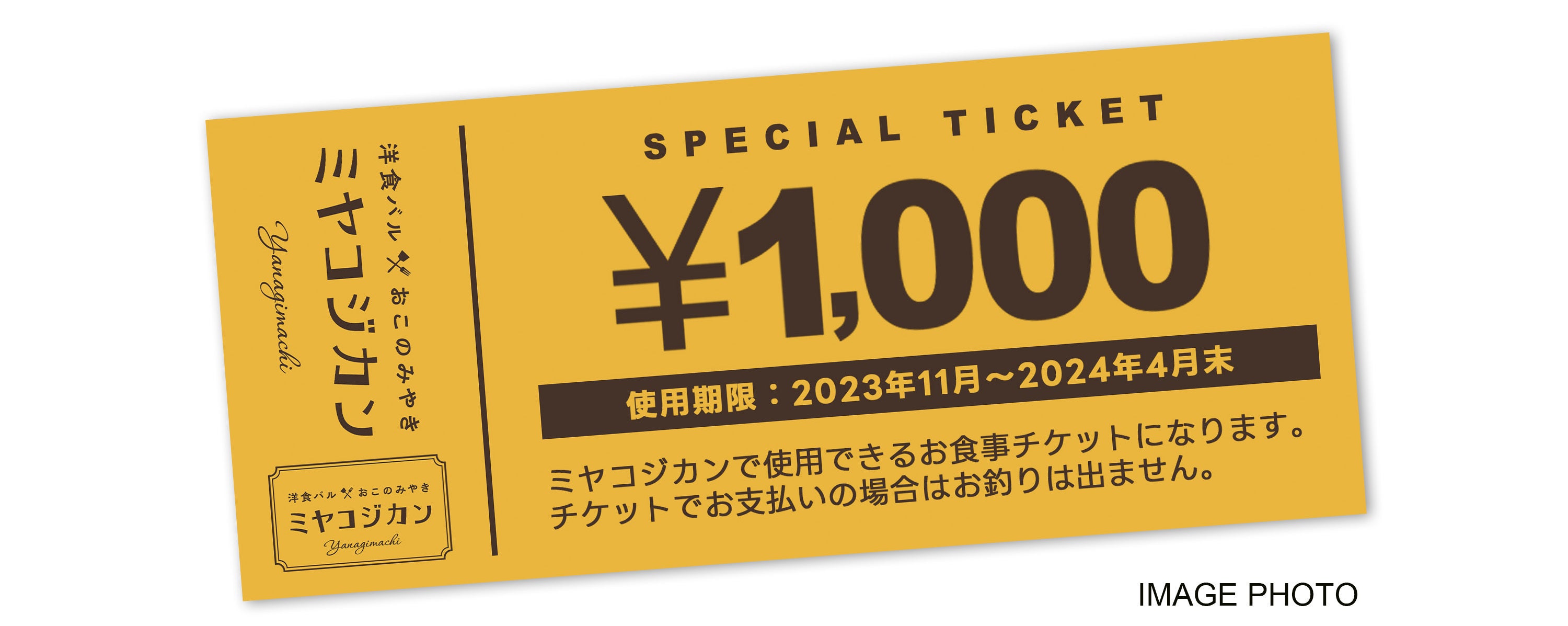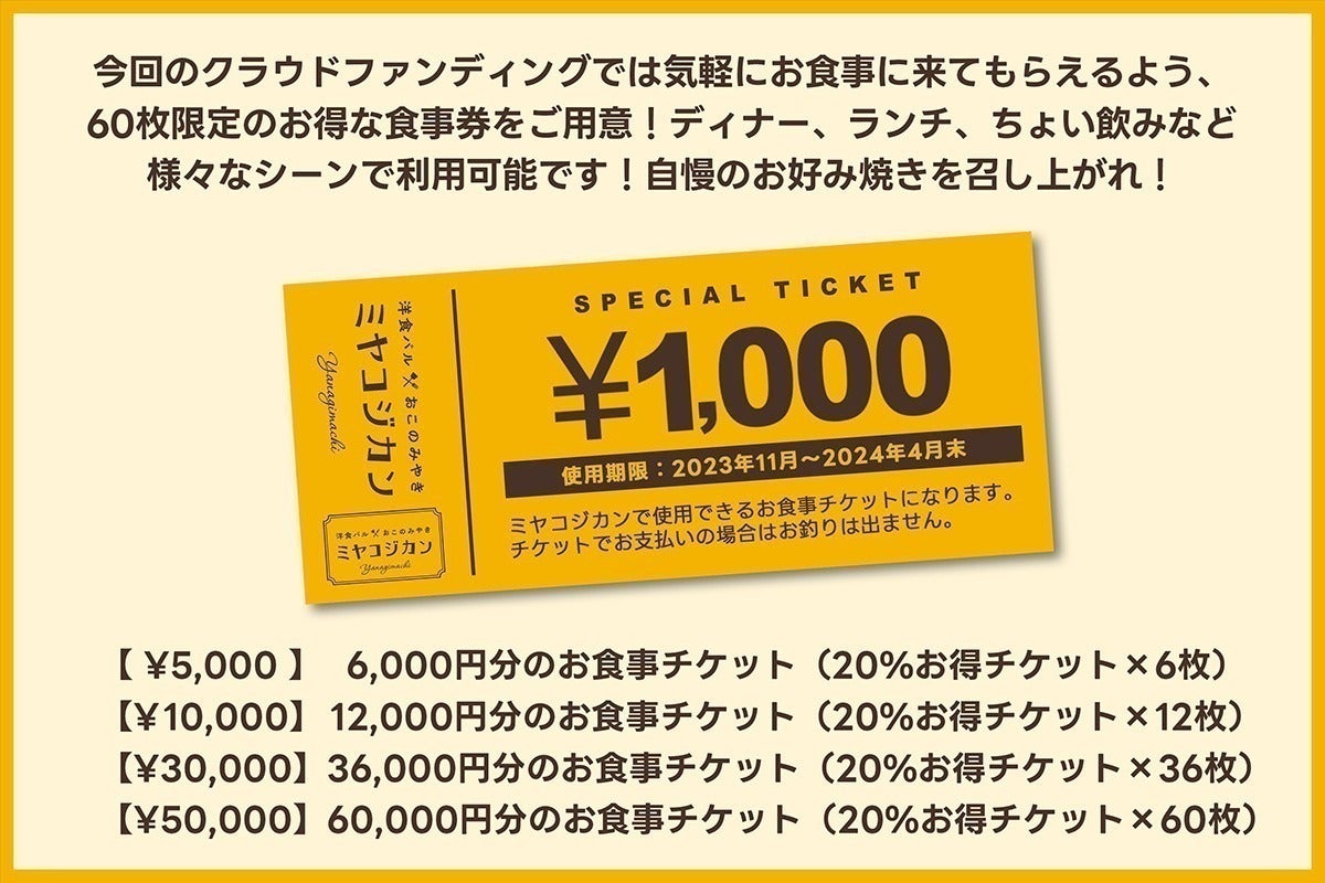 リターンのお食事チケットはミヤコジカンの店舗にてお渡しとなります。
