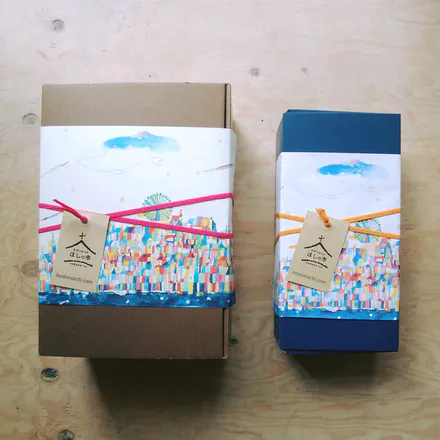 そこに出店くださる複数店舗の商品をまとめて包装できるラッピングブースを設け、その包装(アートかけ紙)も浜松の魅力が伝わるものにしたくて、地元の若手クリエイターさんに絵を描き下ろしてもらいました。当初の目標としては、数人のクリエイターさんの作品を数種類ずつ並べて選んでもらうような形にしたかったのですが、まずは自分たちの自己負担になっても1種類作ってみよう! と、浜松市在住の若きクリエイター・中村菜月さんに依頼。描き下ろしてもらったのがこの作品です。