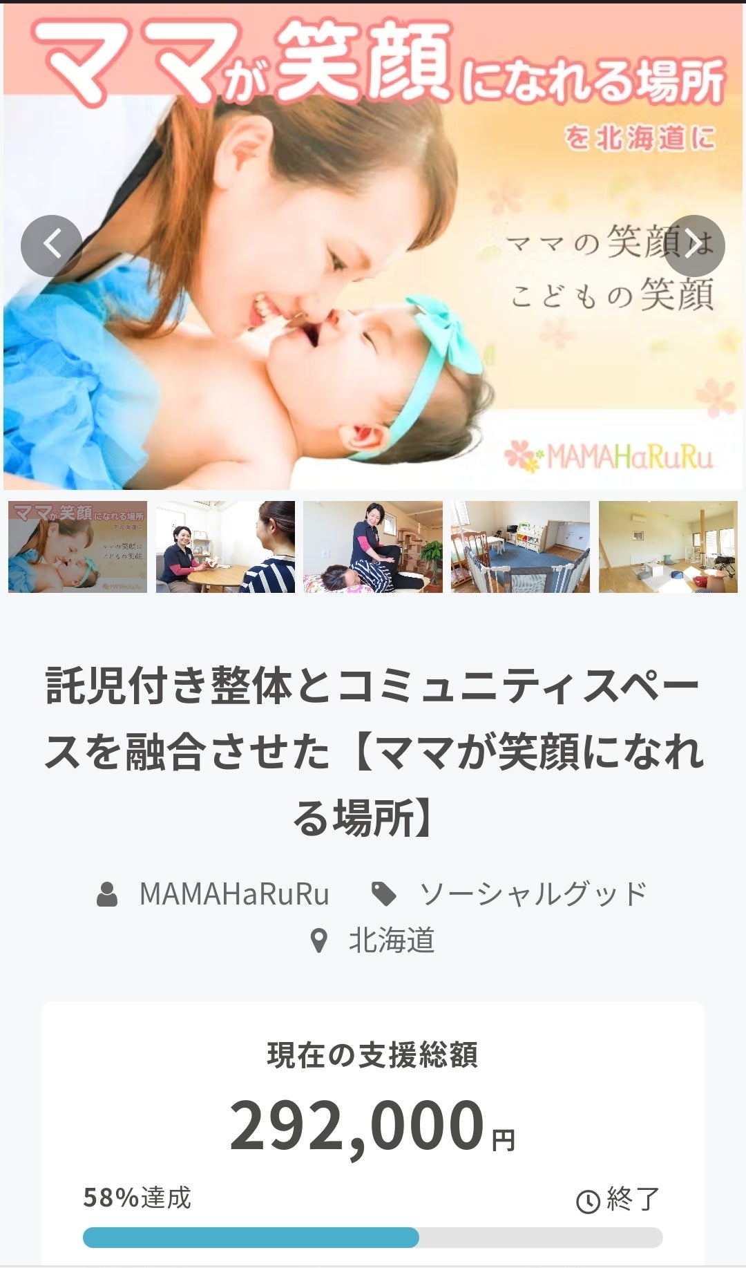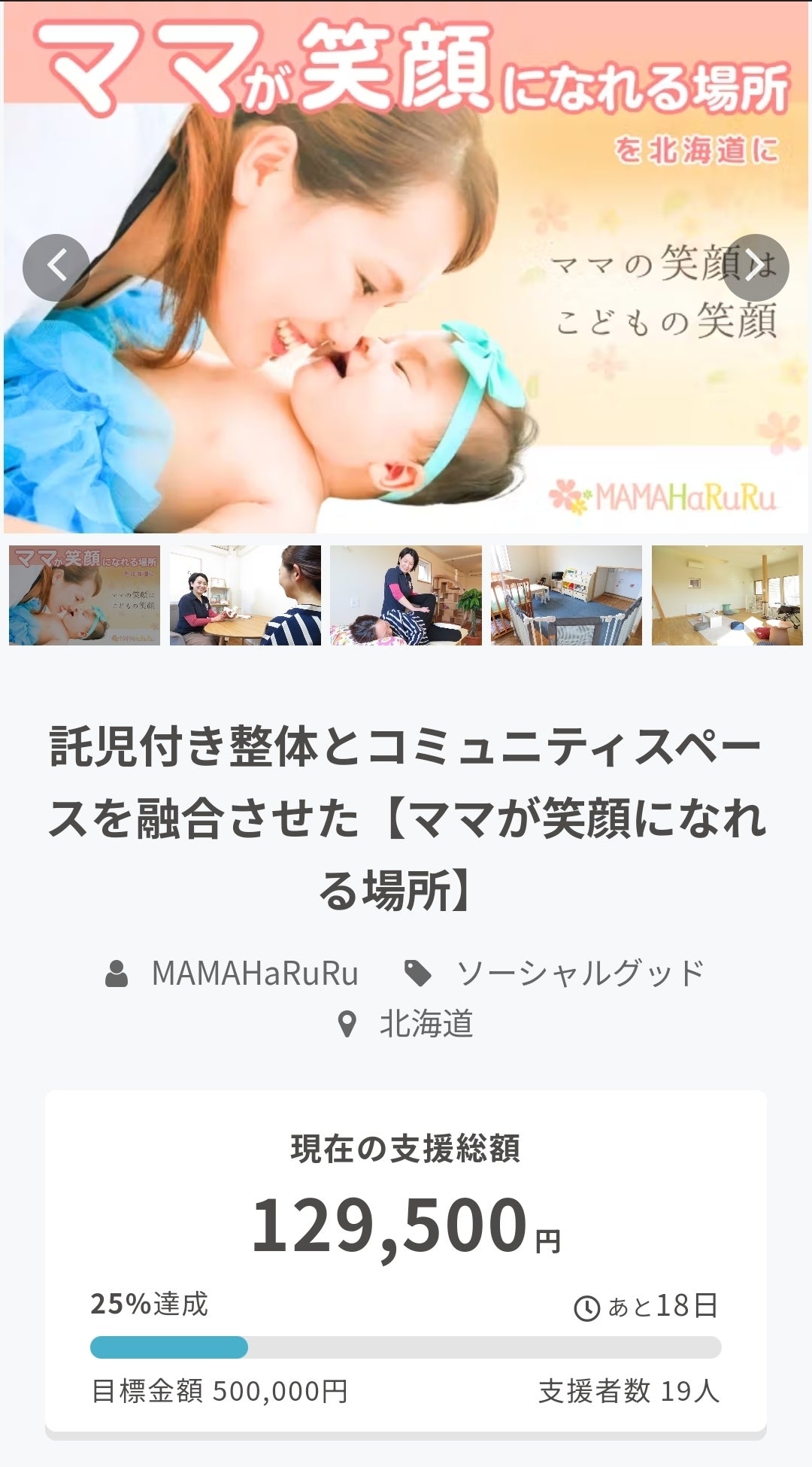 2023/06/12 18:00この度はママハルルの活動を応援して頂き誠にありがとうございます!託児付き整体とコミュニティスペースを融合した【ママが笑顔になれる場所】を北海道の中心に位置する旭川に創ろうとクラウドファンディングに挑戦して13日が経過しました。現在19名の方に温かいご支援を頂き、目標の25%を達成しました!本当にありがとうございます!!そして引き続き私の想いを読んで頂いて応援したいと思ってくださった方は、せびご支援お願いします。https://camp-fire.jp/projects/view/665158?utm_campaign=cp_po_share_mypage_projects_show特に産後のママは目の前の子どものことに一生懸命で自分のことは二の次三の次…でもどんな子育てのノウハウよりもまずはママが笑顔になることがこどもの笑顔、そして家族の笑顔に繋がると私は信じてます!ママの笑顔から、未来を担う子ども達、そして家族、社会の笑顔に繋がる連鎖をママハルルと共に創ってくれる方はぜひ引き続きご協力よろしくお願いします。MAMAHaRuRu 河田麻美 もっと見る