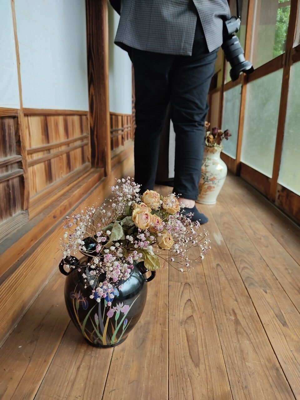 この日は和室での撮影。着物を整えたりポージング指示しているところですね。