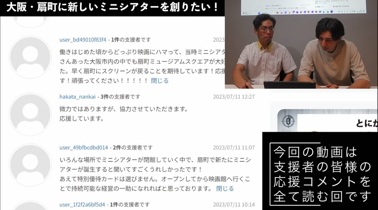 今回は支援者の皆様からお寄せいただきました応援コメントを扇町キネマスタッフの宮下・キャメロンが読みあげコメントを返させていただきました。