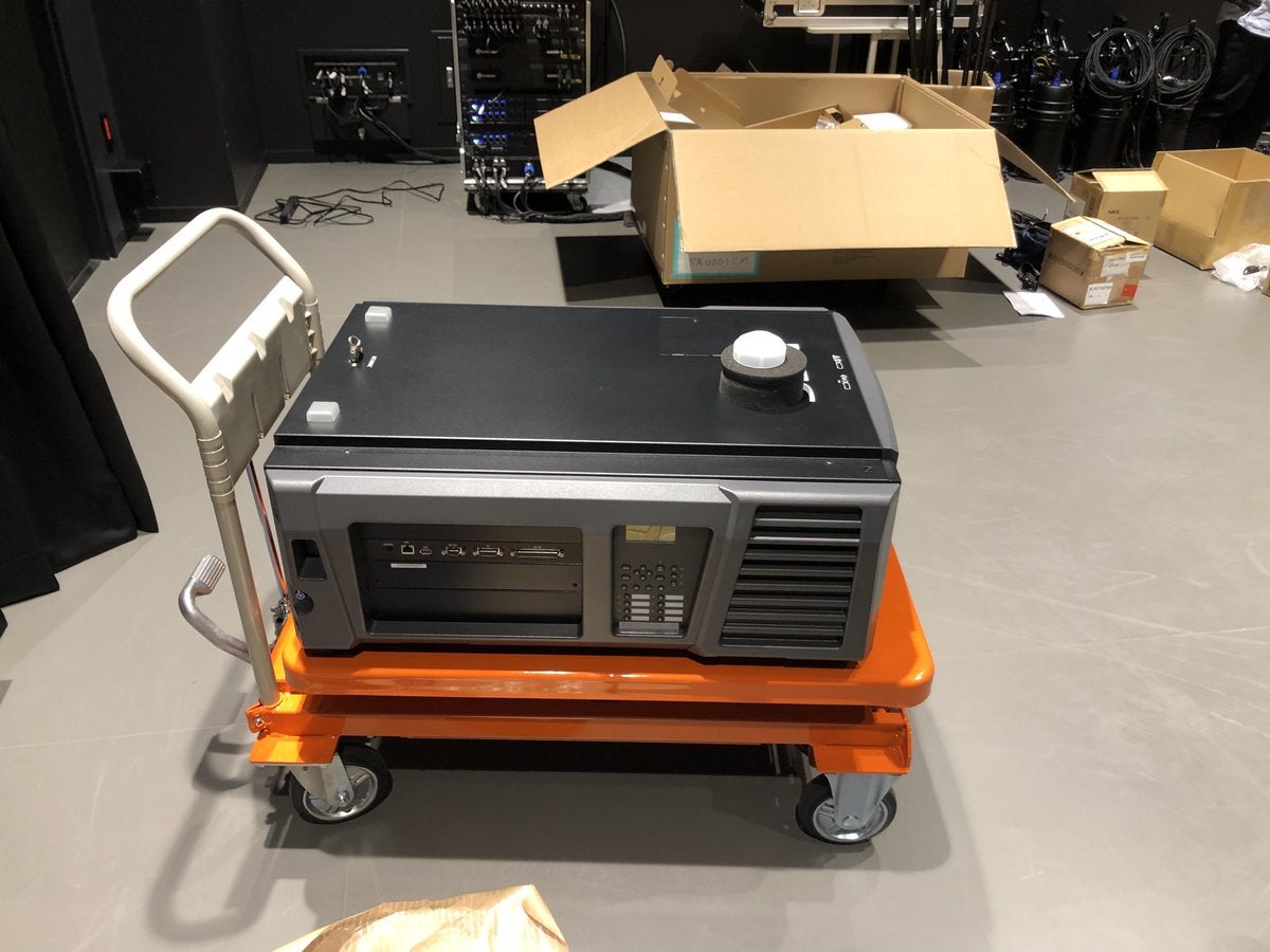 一番要の機材です。通常のプロジェクターと異なりかなり大きく、重さもあるため設置も一苦労です。油圧式の昇降台でジャッキアップして劇場上部に固定をします。