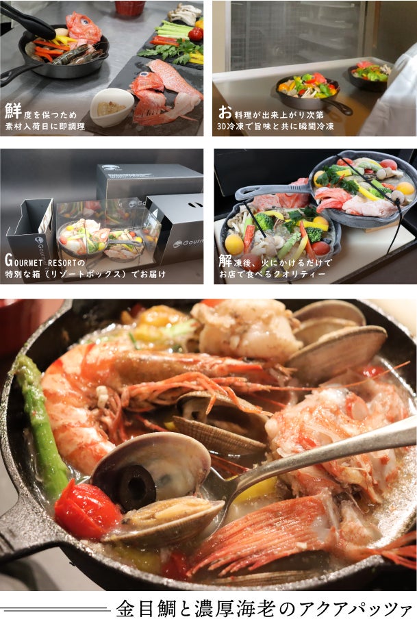 例えばGOURMET RESORTの商品〈金目鯛と濃厚海老のアクアパッツァ〉の場合、冷凍便で届いたお料理をそのままの状態で自然解凍します。解凍されたらスキレットを火にかけて具材に火が通ったらお召上がりいただきます。全く手間がかからず、お店で提供されるクオリティーのお料理が「ご自宅」で「簡単に」楽しむことが出来ます。