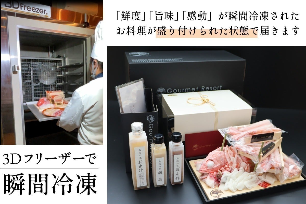 GOURMET KITCHENには食材を急速に冷凍することで解凍後の旨味の低減や食材の食感の低減を防ぐことができる「急速冷凍機(3Dフリーザー)」を保有しています。時間をかけて冷凍するのではなく、素材にこだわった高級料亭やレストランなどで提供されるようなお料理を出来上がり次第、即瞬間冷凍します。ご自宅には冷凍されたお料理が盛り付けられた状態で届くので、調理の手間なくお料理をお楽しみいただけます。