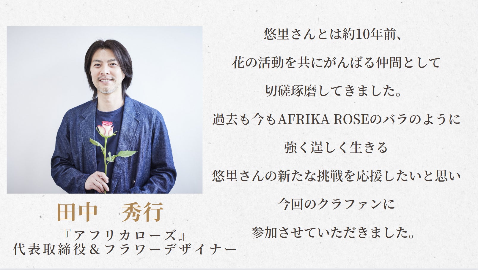 アフリカの大地で育ったローズは、生命力にあふれ、大きく咲き誇り、元気パワーをもらえる華やかな色彩はまさしく今回の乳がん女性専用フォト『UNVEIL』のコンセプトと同じ『強く、たくましく、美しい』ローズです! この生命力あふれるローズを、悠里が厳選したブーケにし、ご希望先にお届けいたします。