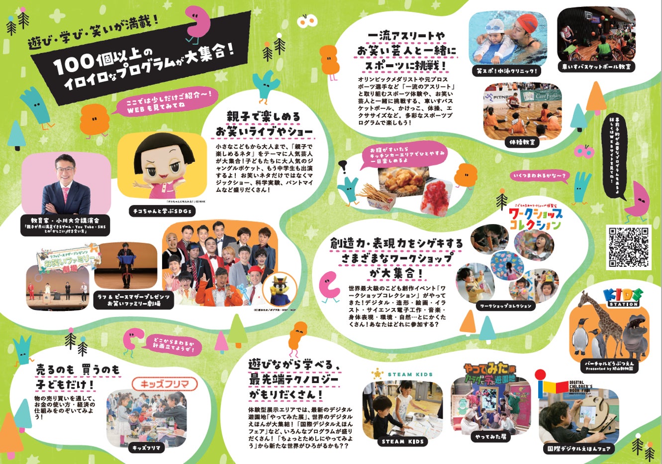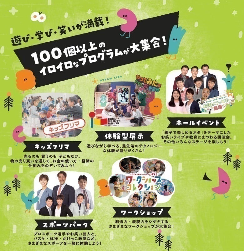 親子を対象として、学びながら楽しく体験できるワークショップ、教育に まつわる講演会やステージイベント、パラスポーツ体験やプロスポーツ選手指導によるスポーツ教室など数多くのイベントを実施。