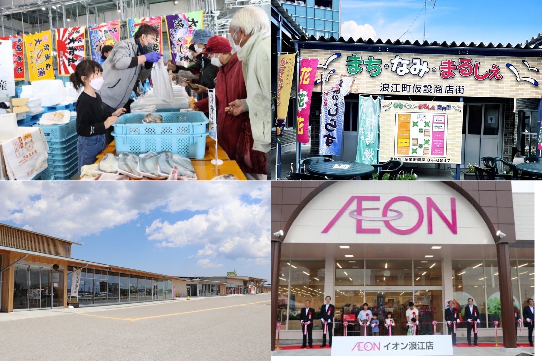(左上:請戸漁港再開、右上:仮説商店街、左下:道の駅なみえ開店、右下:イオン浪江店開店 ※出展 福島県浪江町)