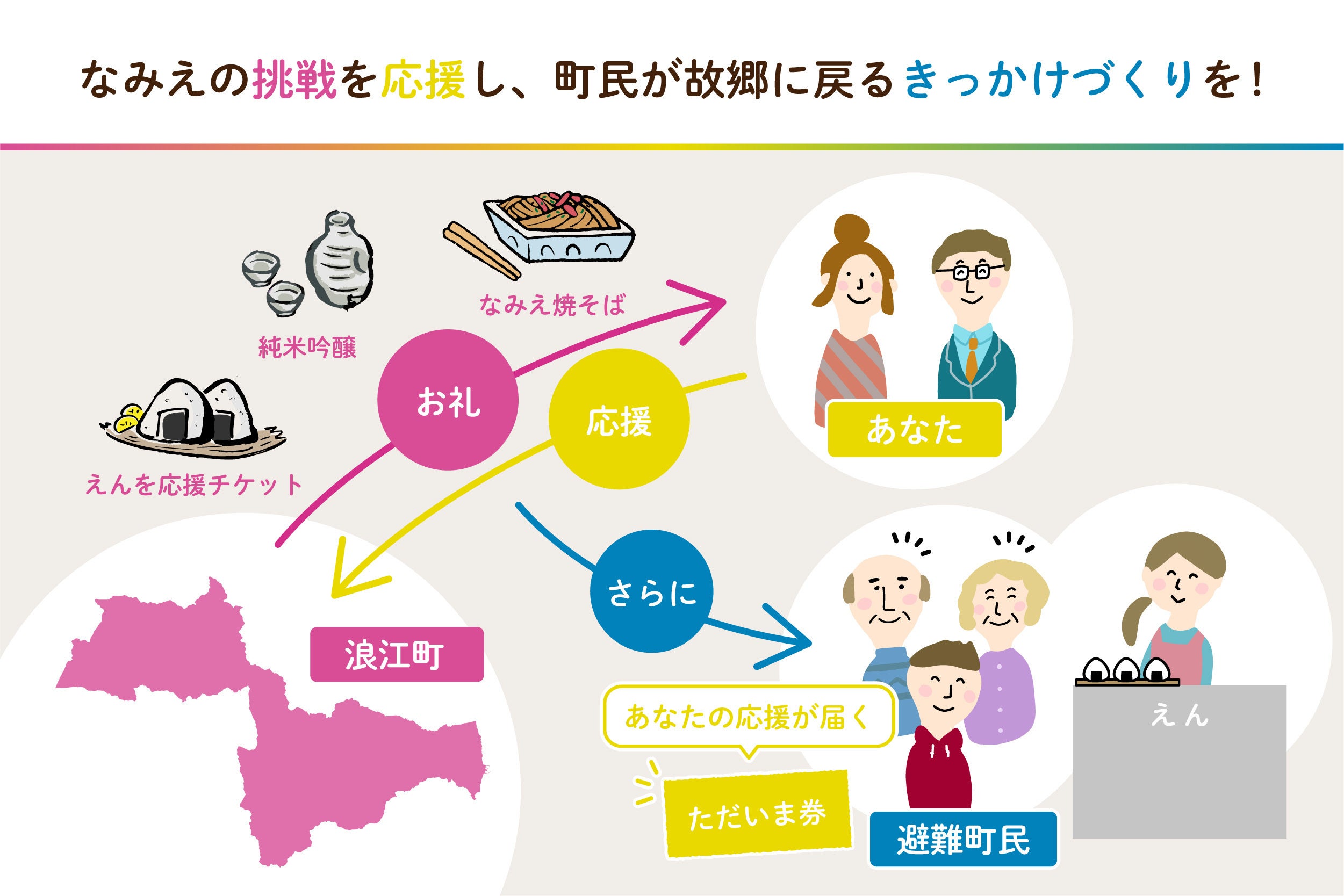 そして私たちと同じ想いを持ち、浪江町に深く携わっていただいているNOFATEさんからご助力いただき、このプロジェクトを立ち上げることにしました。関係した人たち同士が繋がれる、”えん”から始まるものがたり。みなさんのご縁から、この浪江町が世界で一番活気溢れるまちになりますように!