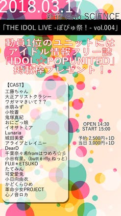 2018/03/10 13:562018年03月17日(土)新宿 club SCIENCE東京都新宿区歌舞伎町2-25-6 永和第6ビル B1F 【タイトル】「THE IDOL LIVE -ぽぴゅ祭!- vol.004」 【CAST】工藤ちゃん / 大正アリストクラシー / ワガママきいて?? / 水萌みず / 小牧蒼 / 鬼塚真紀 / おにごっ娘 / イオサトミア / Lunaria / 城田美愛 / アライブとレイニー / DearD / 千葉奈々希fromはつめろ☆彡 / 小谷有里。(buttёrfly.ねっと) / FUJI*ETSUKO / たてみん / 可愛愛兎 / 小日向由衣 / かどくらひめ / 革命少女PROJECT / 心ノ音ロカ OPEN 14:30START 15:00 予約 2,500円当日 3,000円(別途ドリンク代) 【問い合わせ】新宿SCIENCE03-6233-9006 もっと見る