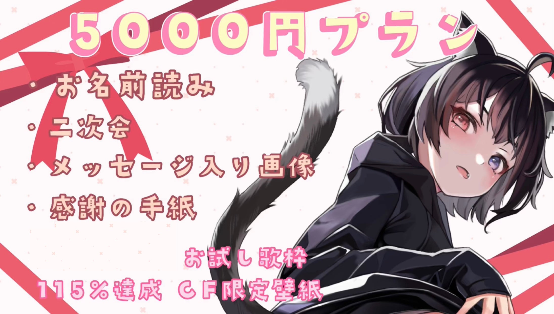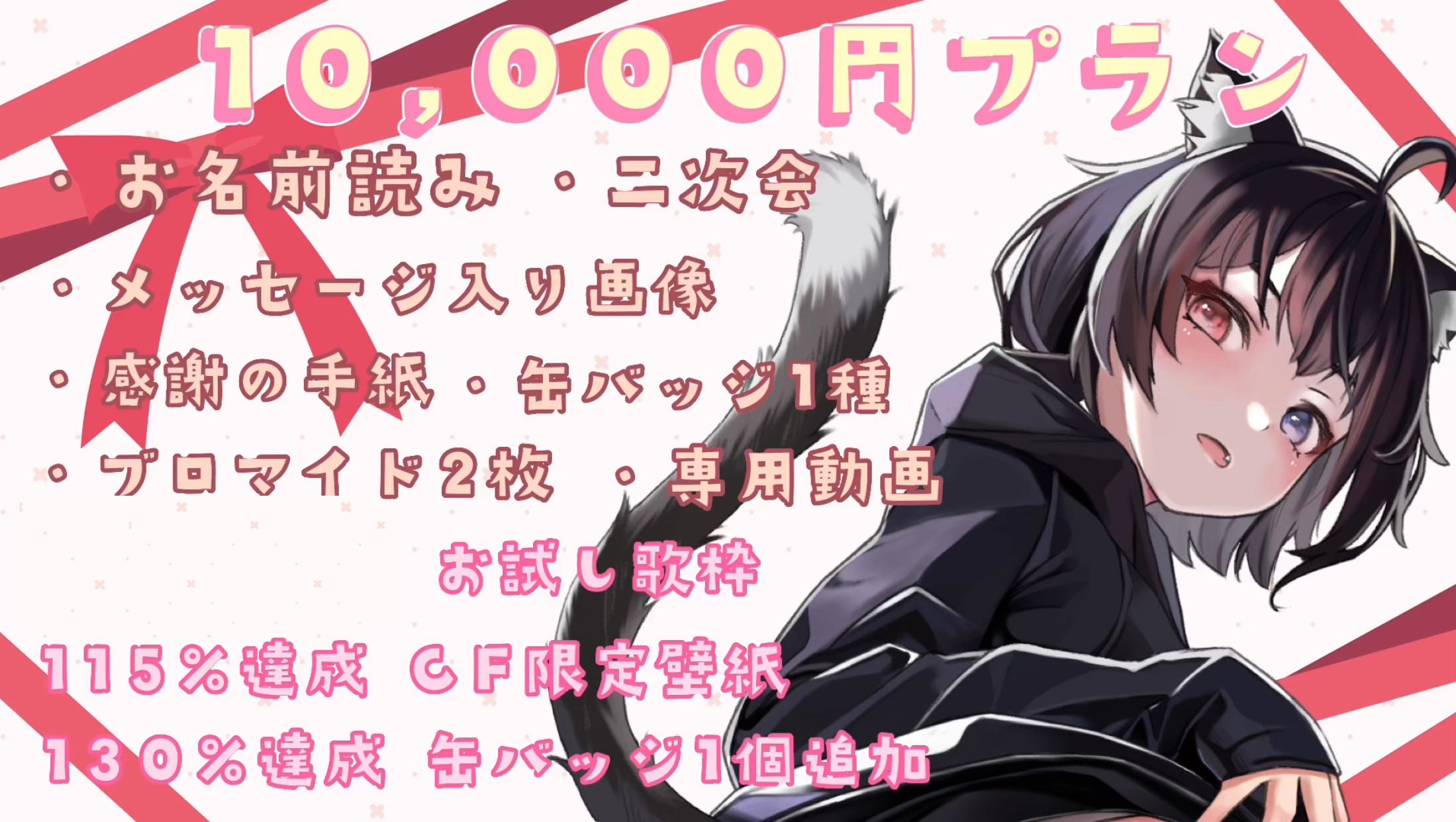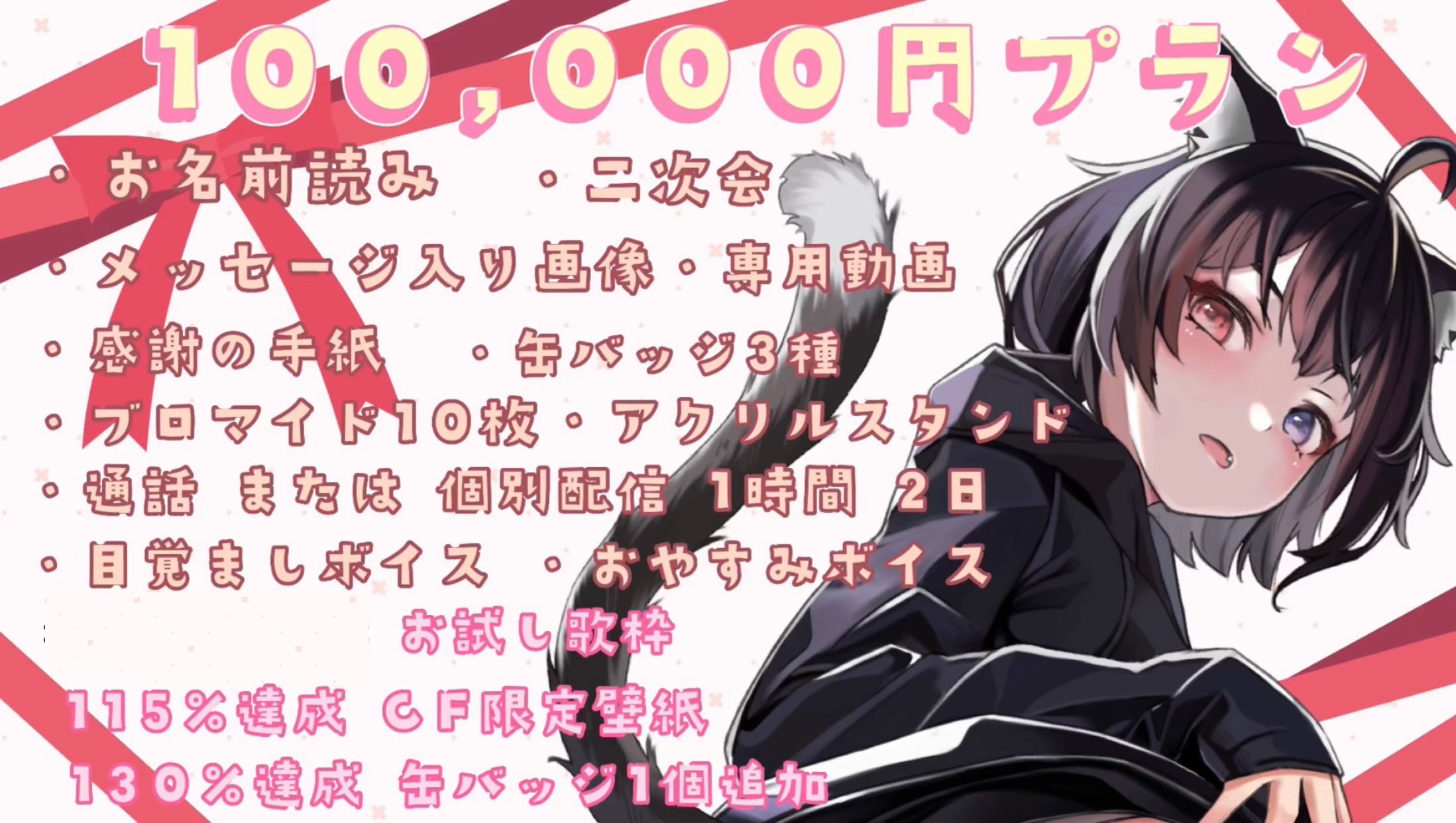 動画 / お手紙 / 二次会の内容 / 100%達成の歌枠 / ストレッチゴール達成の壁紙 / ミニメッセージカード / 通話・個別配信内容(通話した事を書き込むことも×) / ボイス