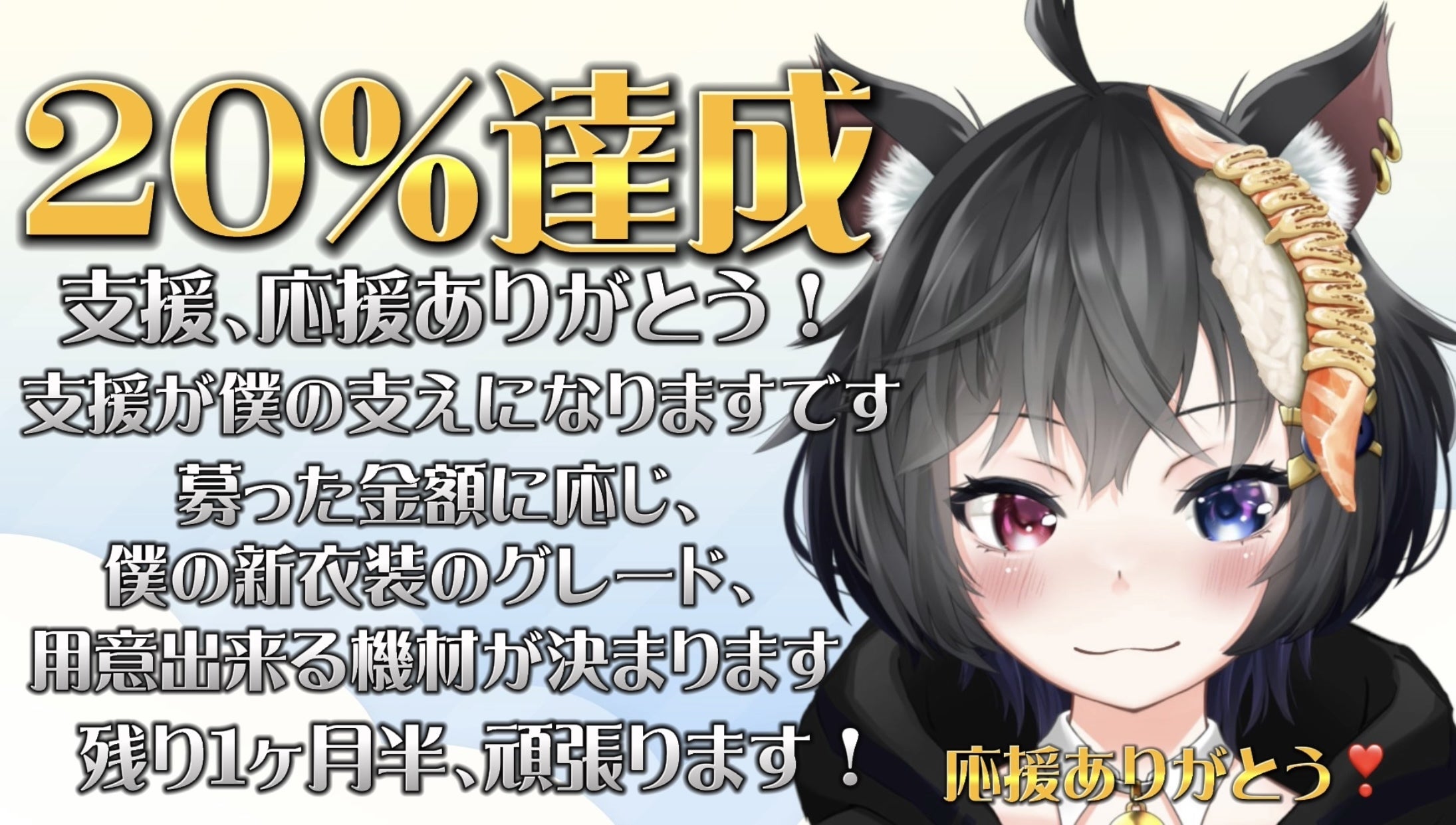 2023/05/02 13:1520%を達成しました!支援、応援してくださってる方、本当にありがとうございますです...!支援達成金額により、僕が着れる新衣装の差分やグレードが変わってくるのと、購入出来るマイクやインターフェイスが限られて来ますので、まだまだ拡散や日頃の配信を頑張りますです...!本当に皆さんありがとうございますです...!暖かく見守って頂けると嬉しいのです! もっと見る