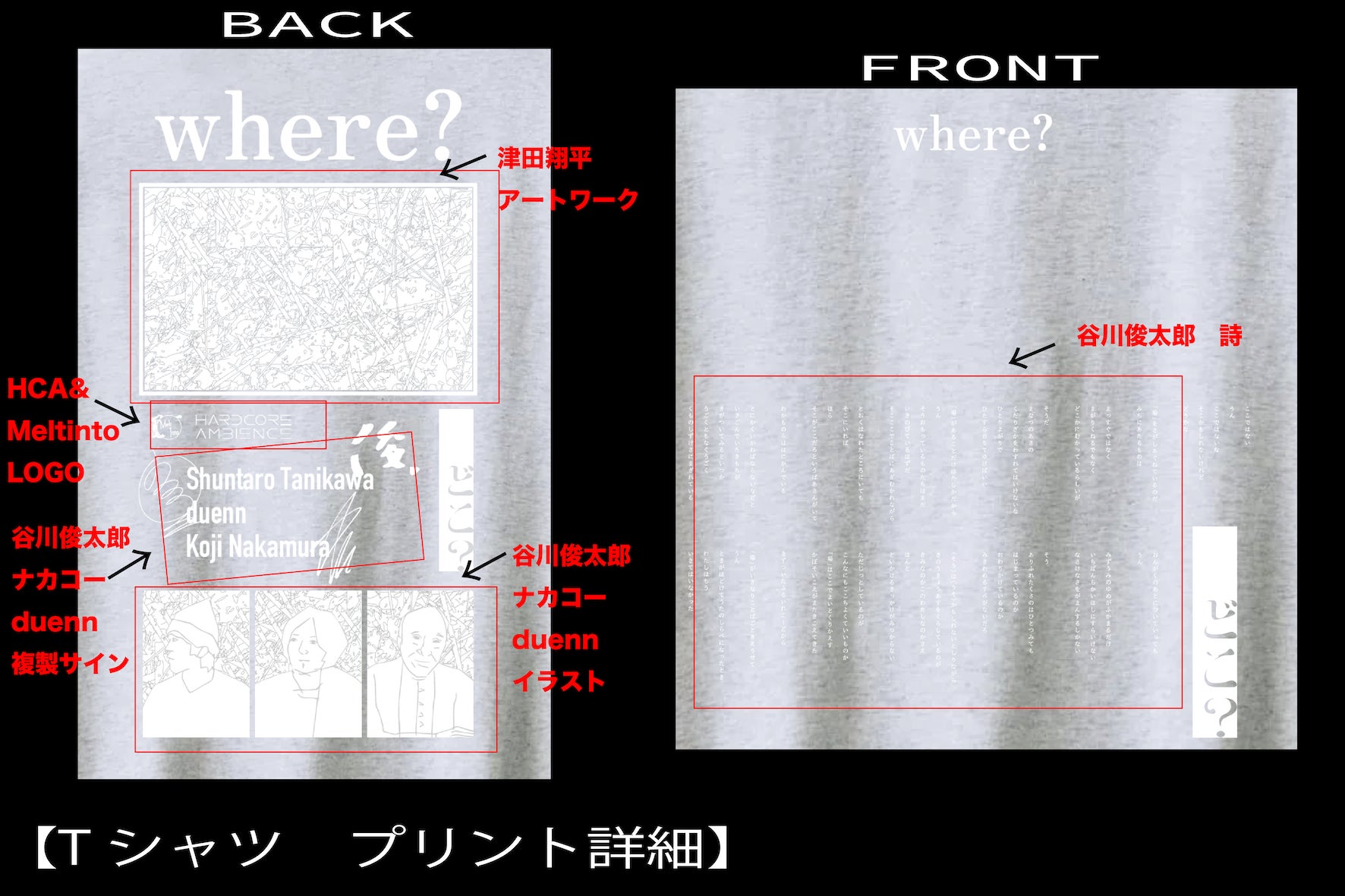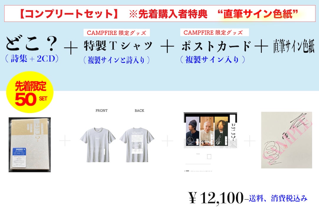 複製サインと"どこ"の詩がデザインされたオリジナルTシャツ+『どこ?』(詩集+2CD)のセットです。