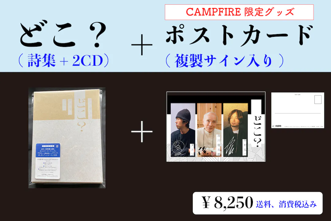 複製サイン入りのポストカード+『どこ?』(詩集+2CD)のセットです。