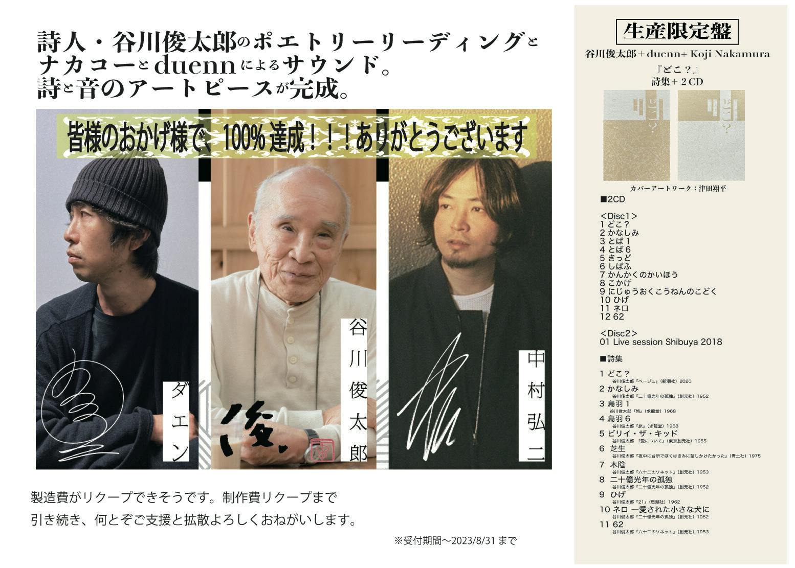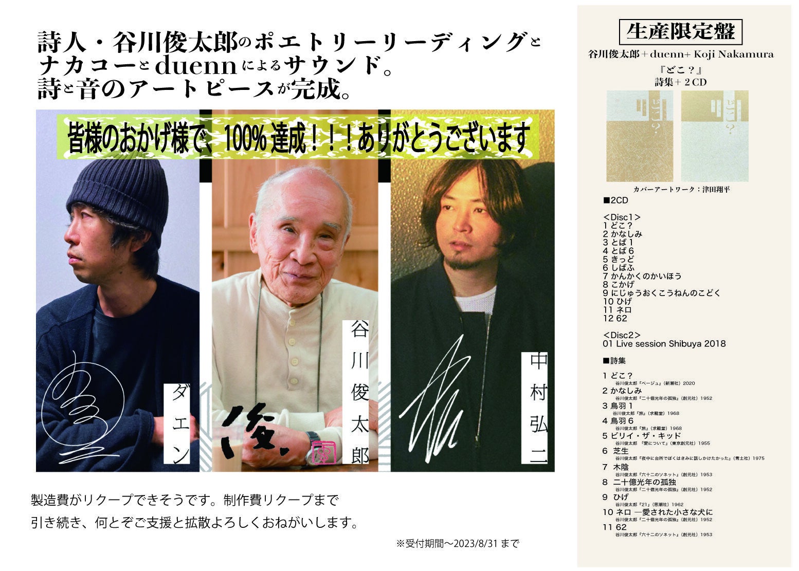 複製サイン入りのポストカード+複製サインと"どこ"の詩がデザインされたオリジナルTシャツ+『どこ?』(詩集+2CD)の コンプリートセットには、特典として3人(谷川俊太郎、duenn 、ナカコー)の直筆サイン色紙(幅240mm×高さ270mm前後)をご提供します。先着50名様限定、なくなり次第終了となります。
