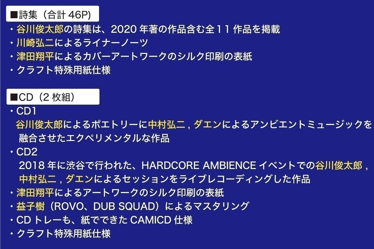 今回の企画は『ポエトリーリーディングをアートピースとして皆様の手元にお届けすること』をコンセプトに、アンビエントとポエトリーリーディングという手法を多くの方に身近に感じていただくことを目標に、長くポエトリーリーディングを行なっておられる、谷川俊太郎さんと一緒に作品を作り上げました。